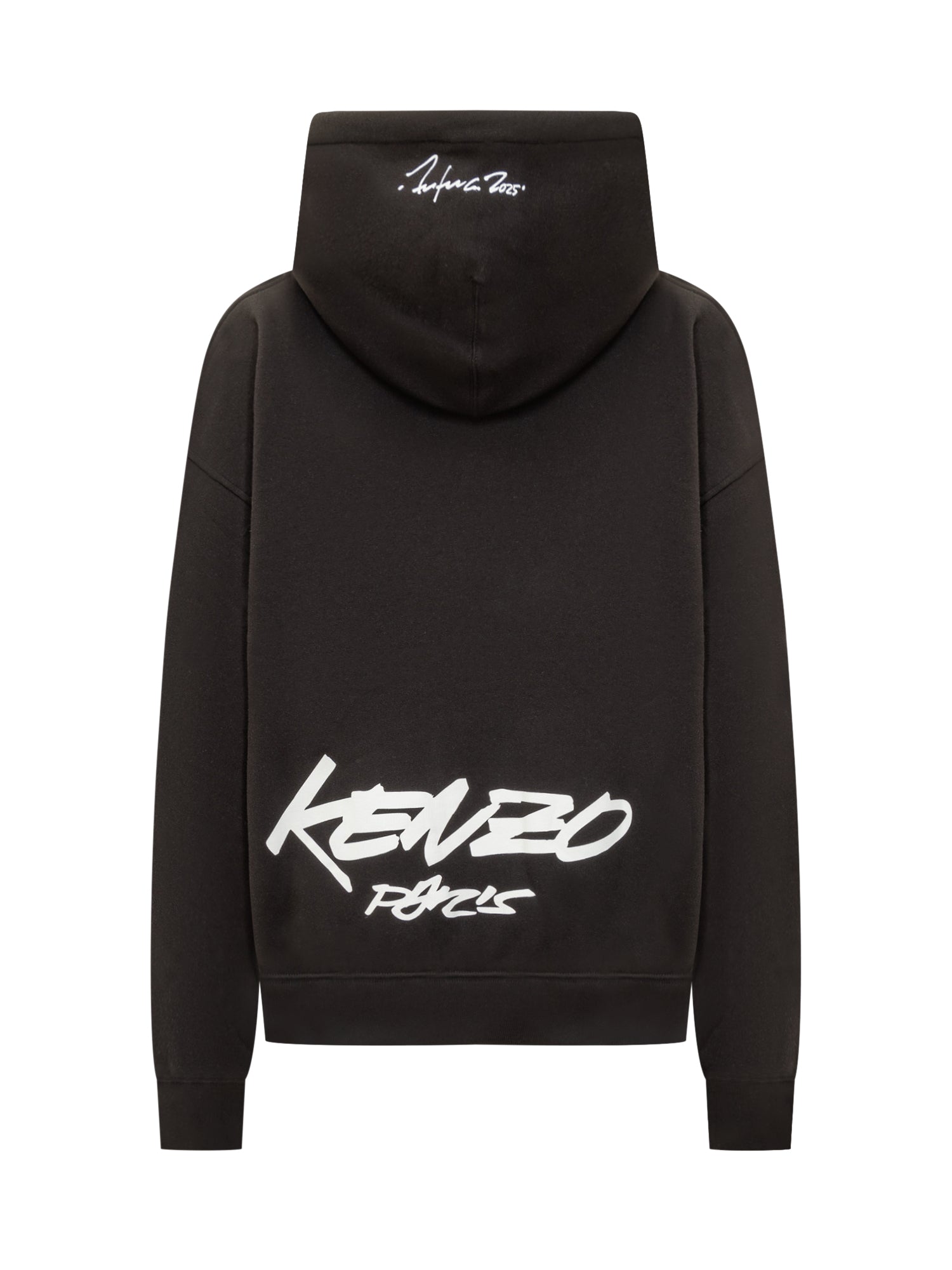 Kenzo black hoodie with a small orange stylized flower on the chest.