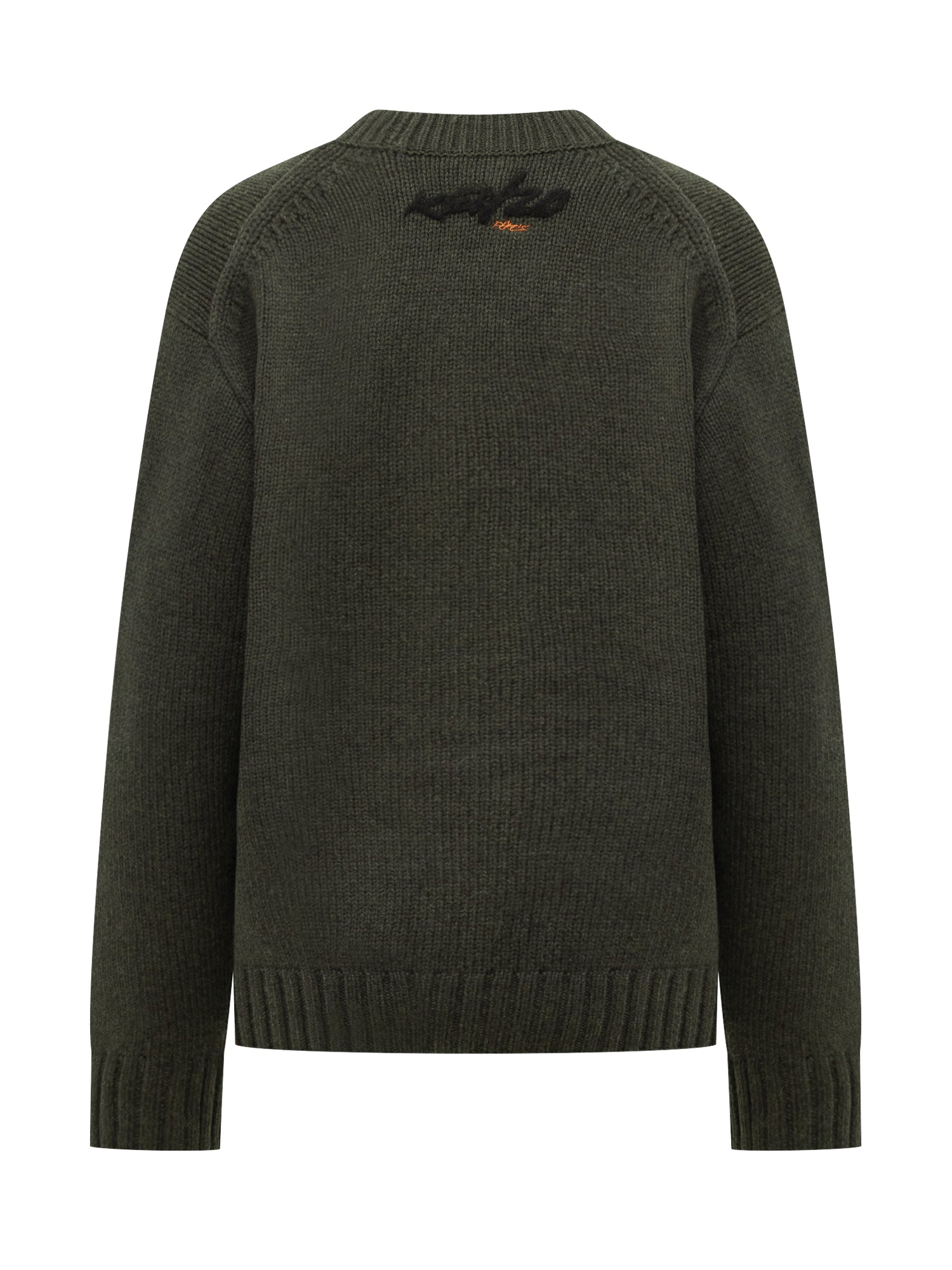 Green wool sweater by Kenzo featuring oversized orange flower graphic with artistic details.