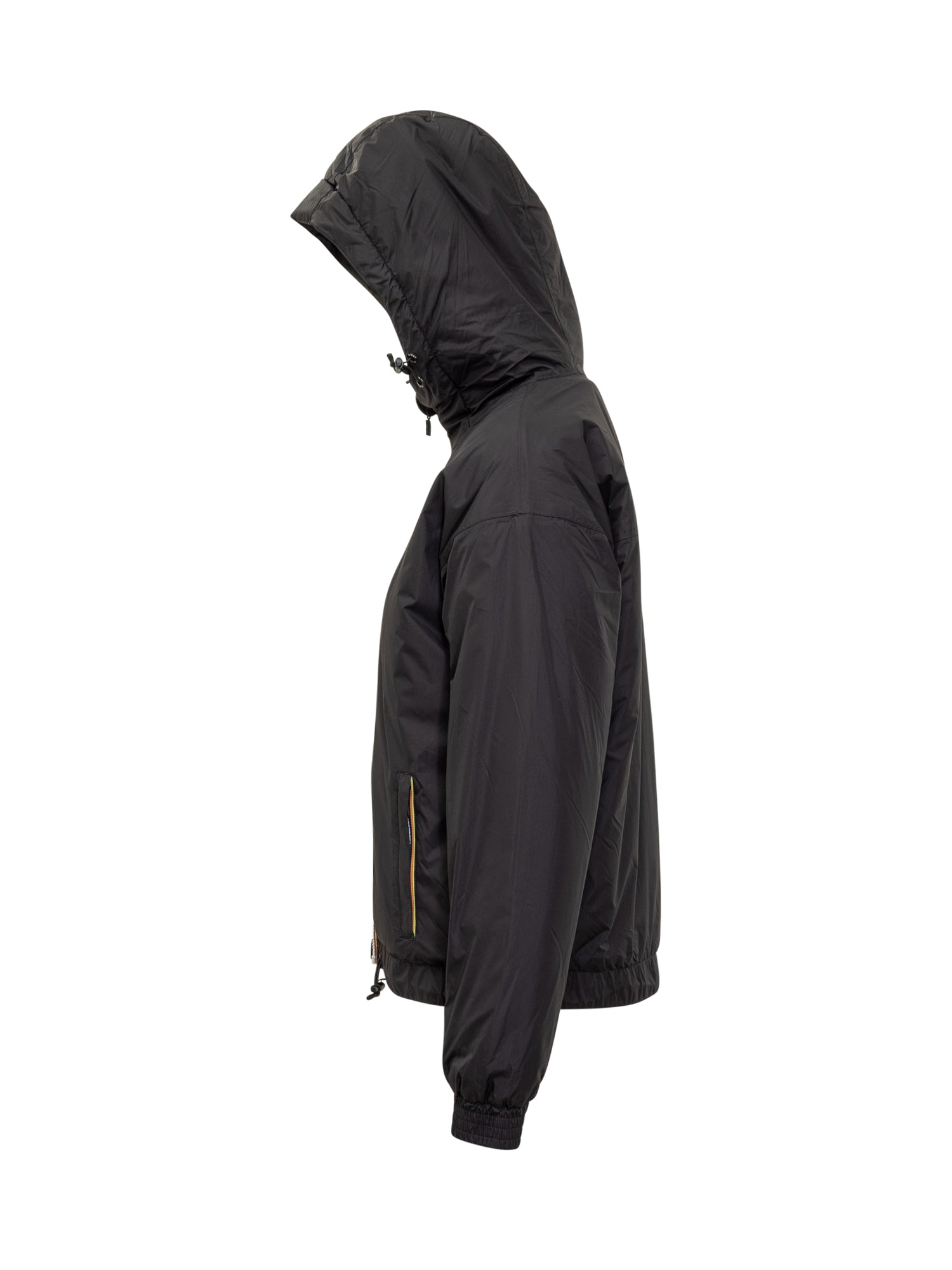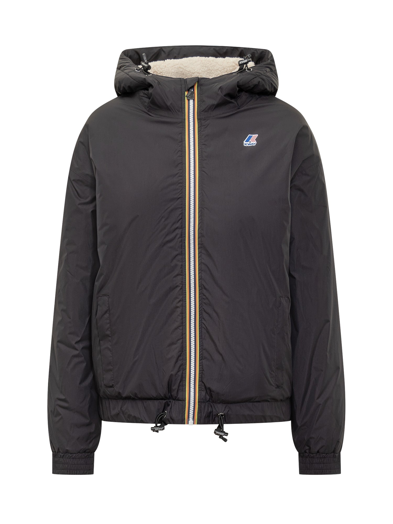 K-Way Levrai 4,0 Albine black jacket with hood and soft teddy lining. Made from waterproof and breathable fabric, featuring multicolor zip and front logo detail.