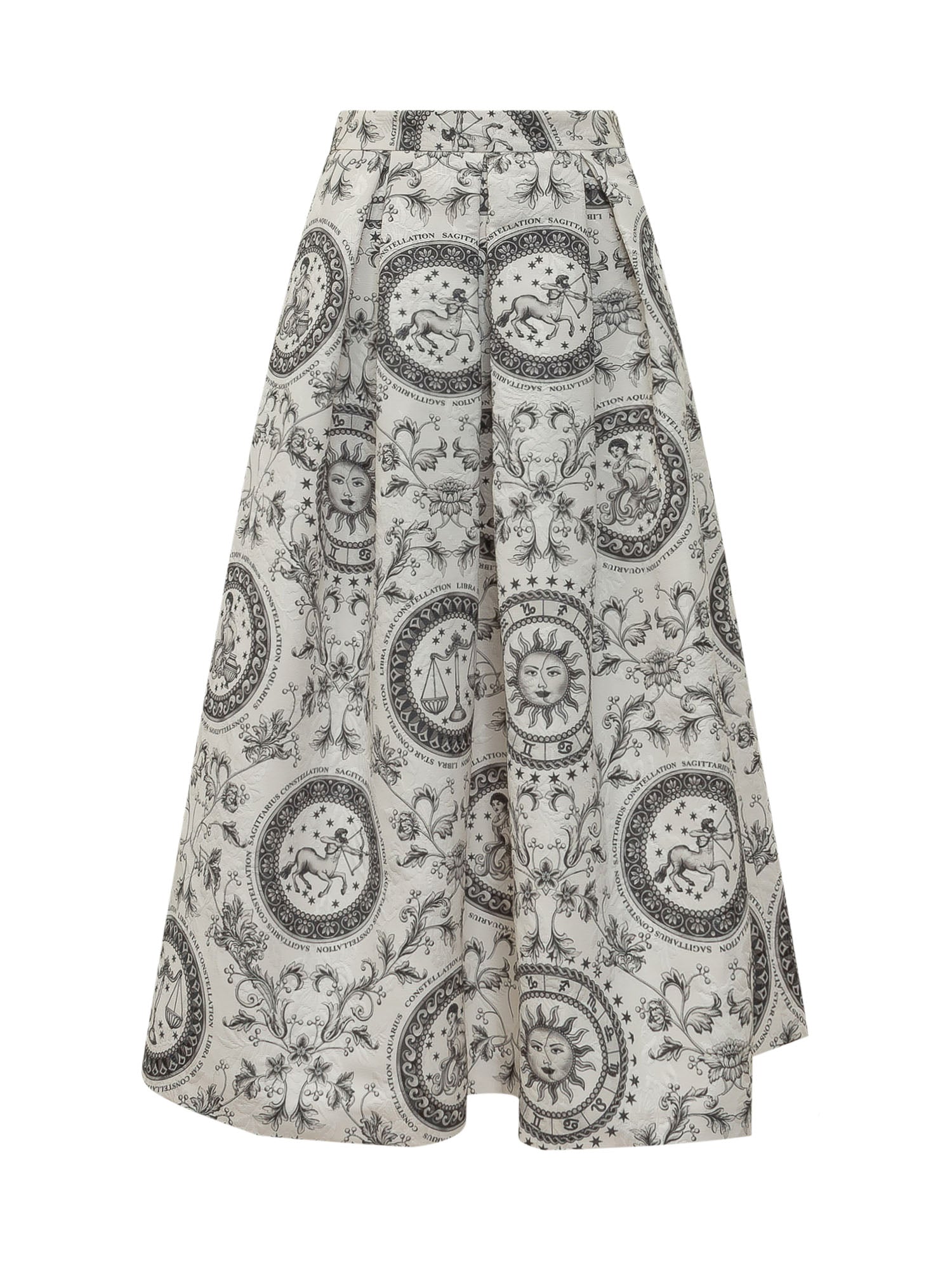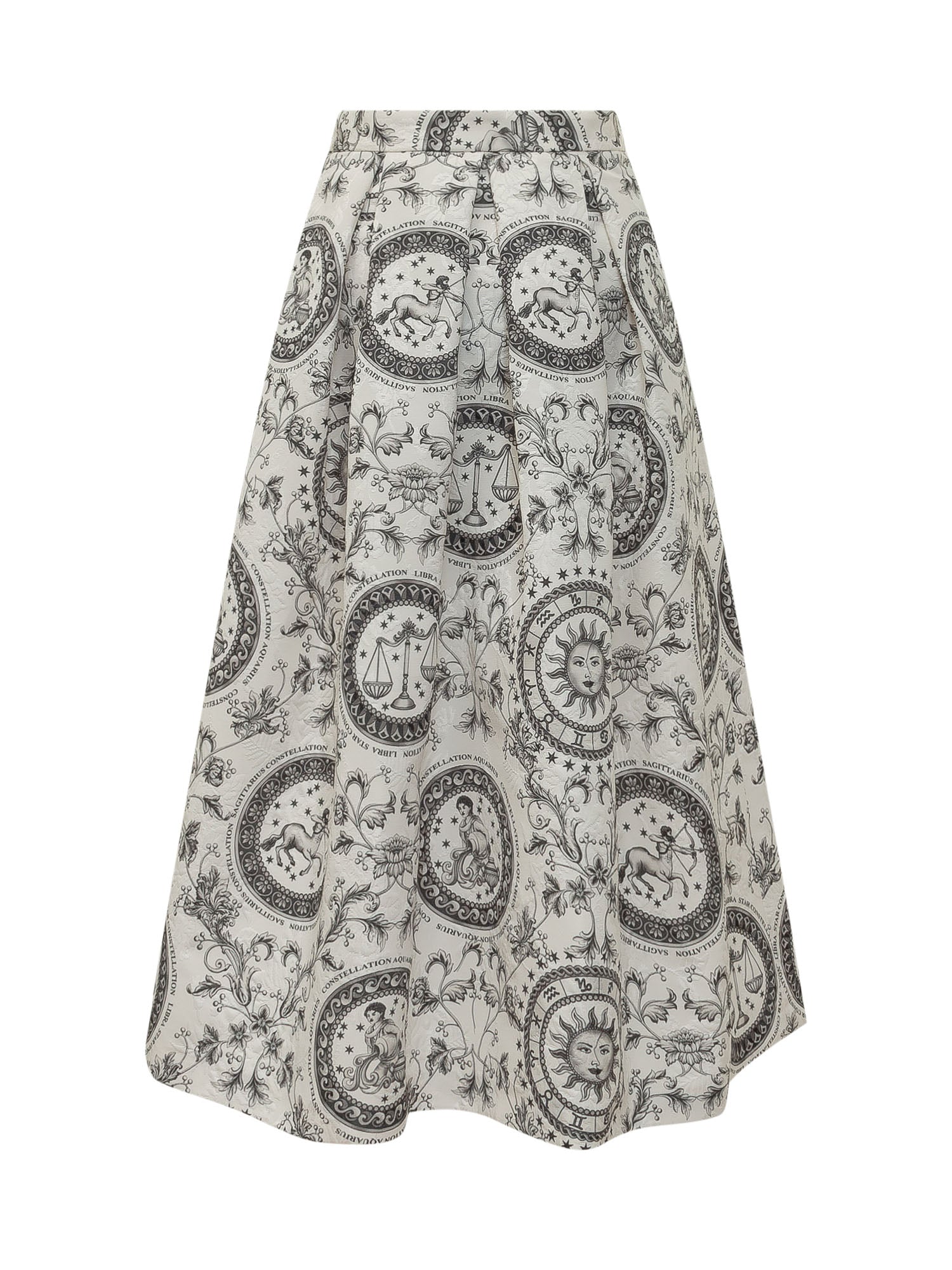 Full skirt with waist pleats and constellation print featuring figurative and decorative motifs. Midi length with structured volume and defined silhouette. Ideal for elegant and distinctive outfits.