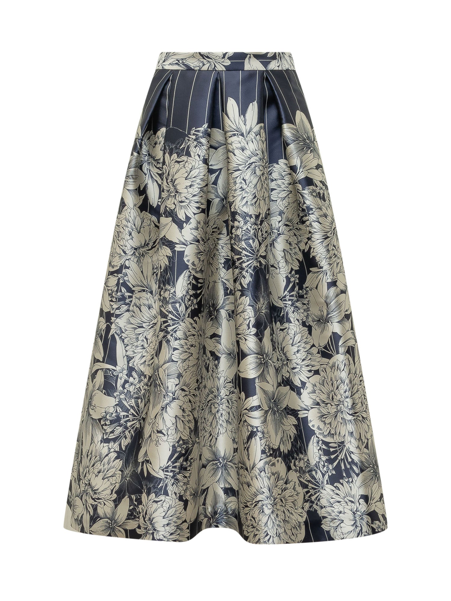 Full skirt with waist pleats and all over floral print. Midi length with generous volume and defined structure. Perfect for refined looks with contemporary appeal.