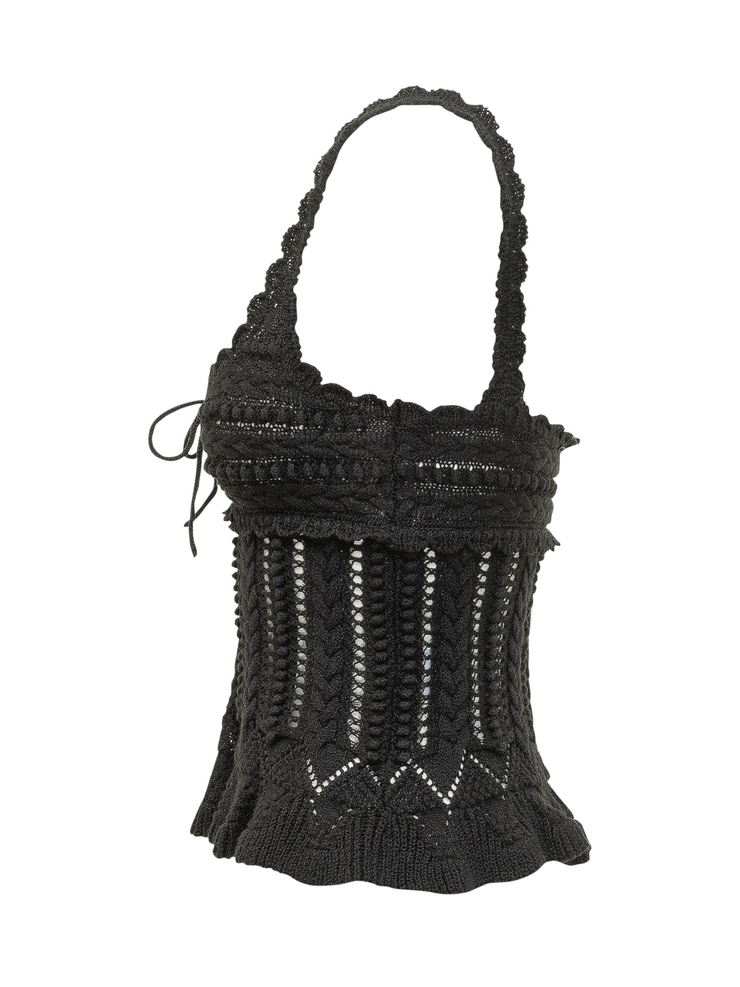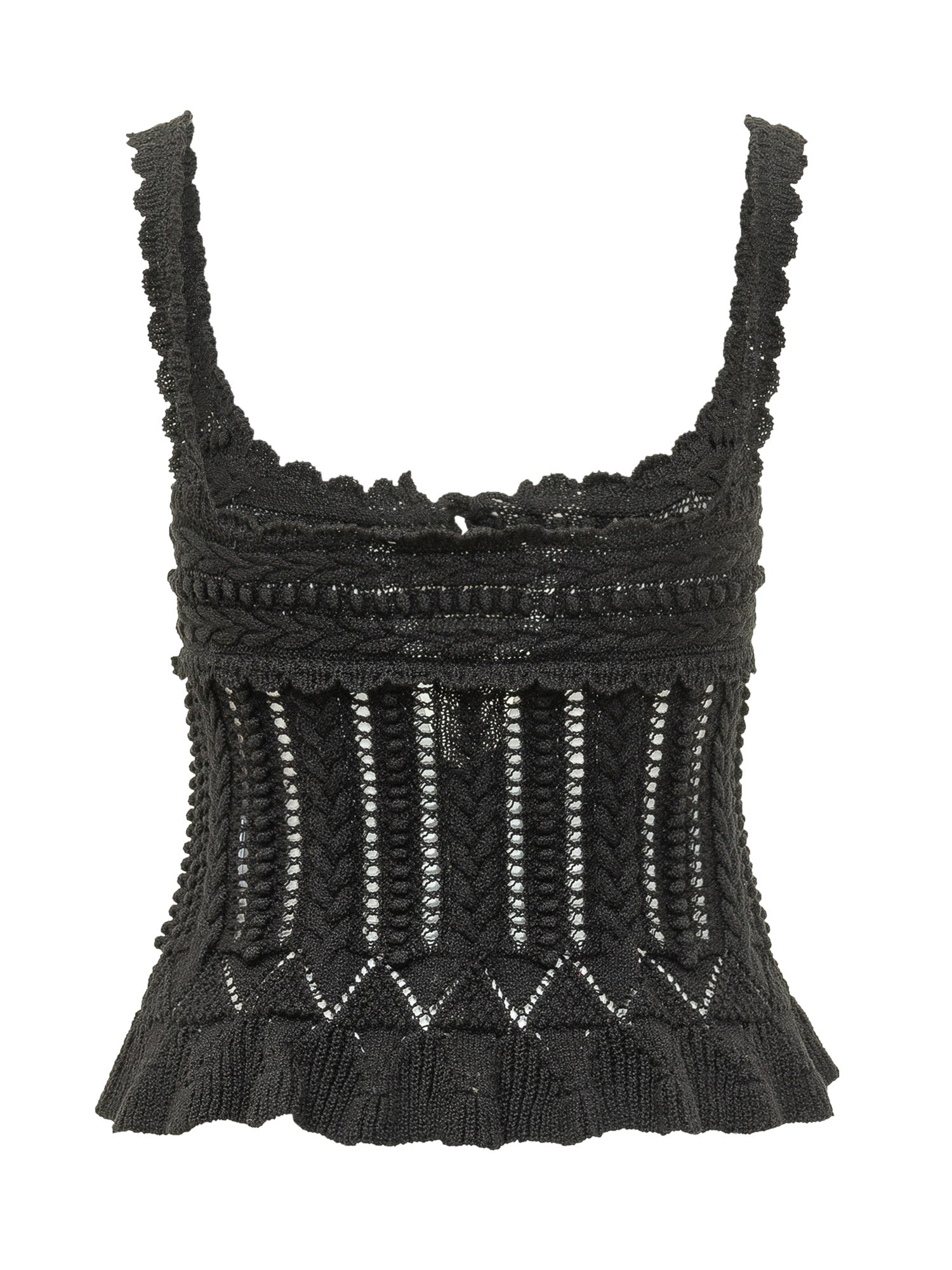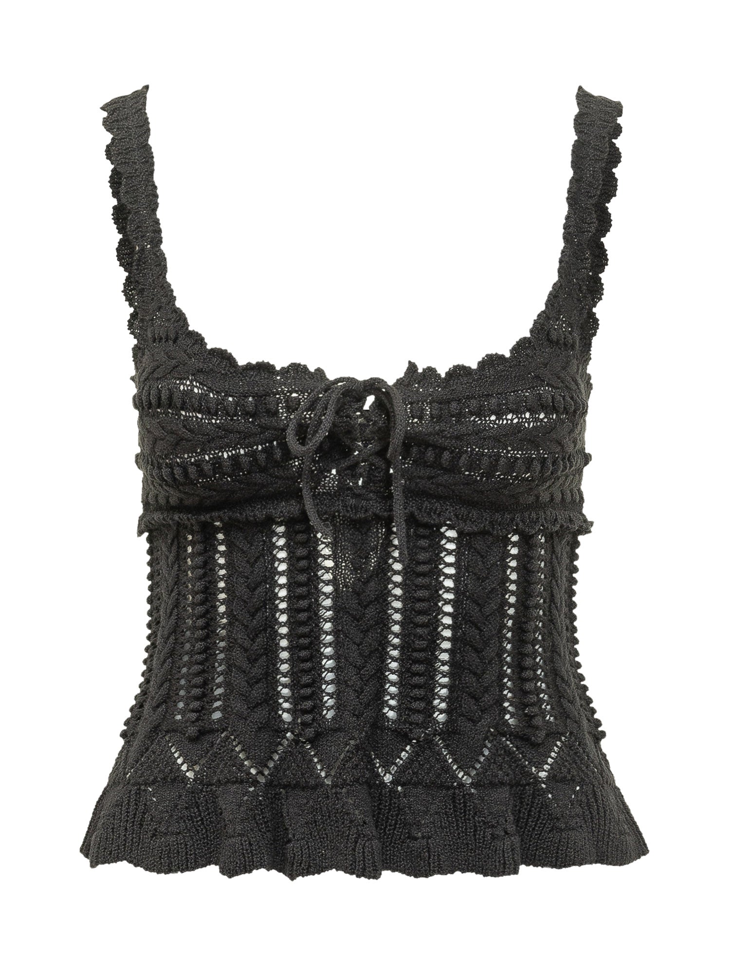 Knit top with wide straps and straight neckline. Design featuring vertical openwork pattern and adjustable front ties. Ruffle hem and fitted silhouette suitable for feminine looks.