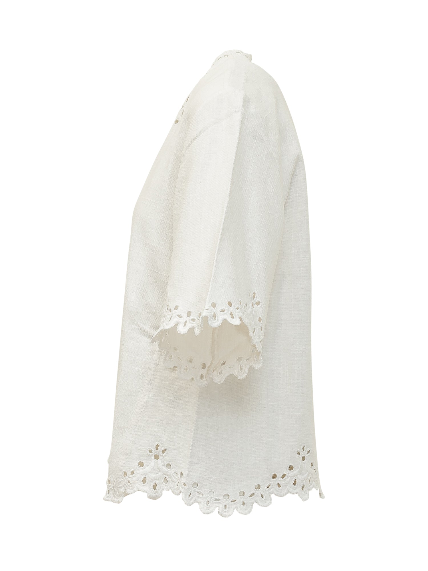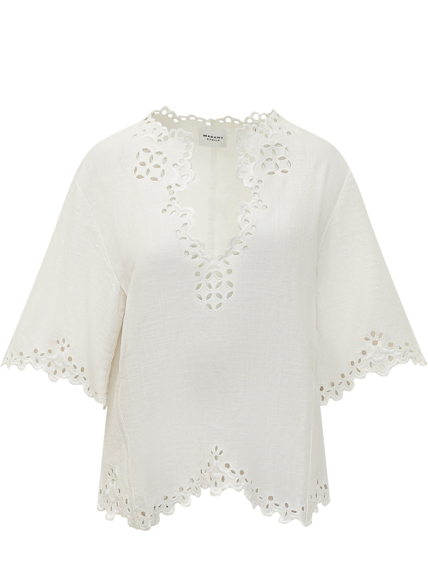 Top with V neck and wide Short-sleeves. Design featuring embroidered and openwork detai on neckline, sleeves and hem. Soft silhouette ideal for summer outfits and leisure time.