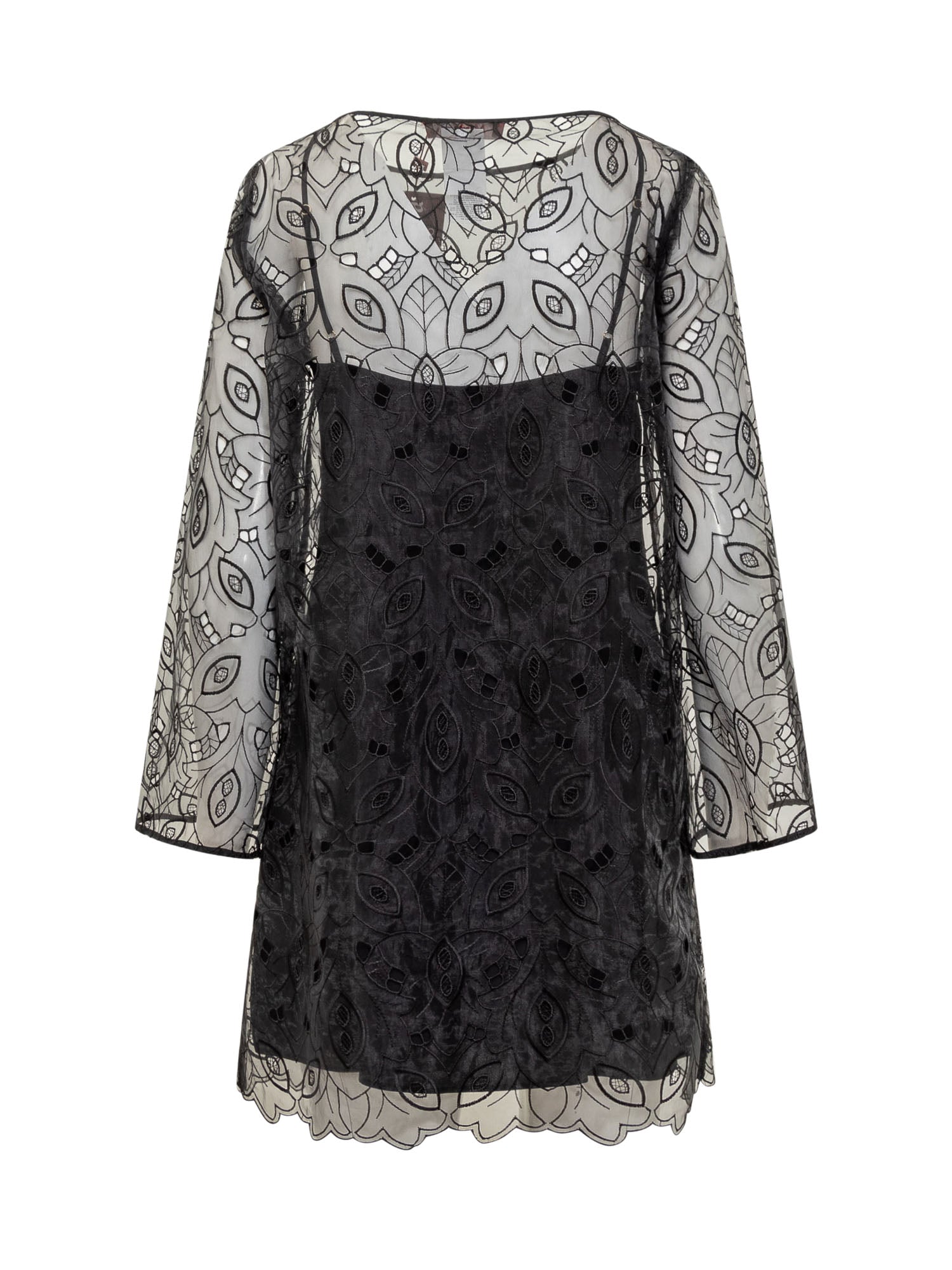 Embroidered organza mini dress. Straight silhouette. Round neckline. Long sleeves flared at bottom. Matching matching matching petticoat.