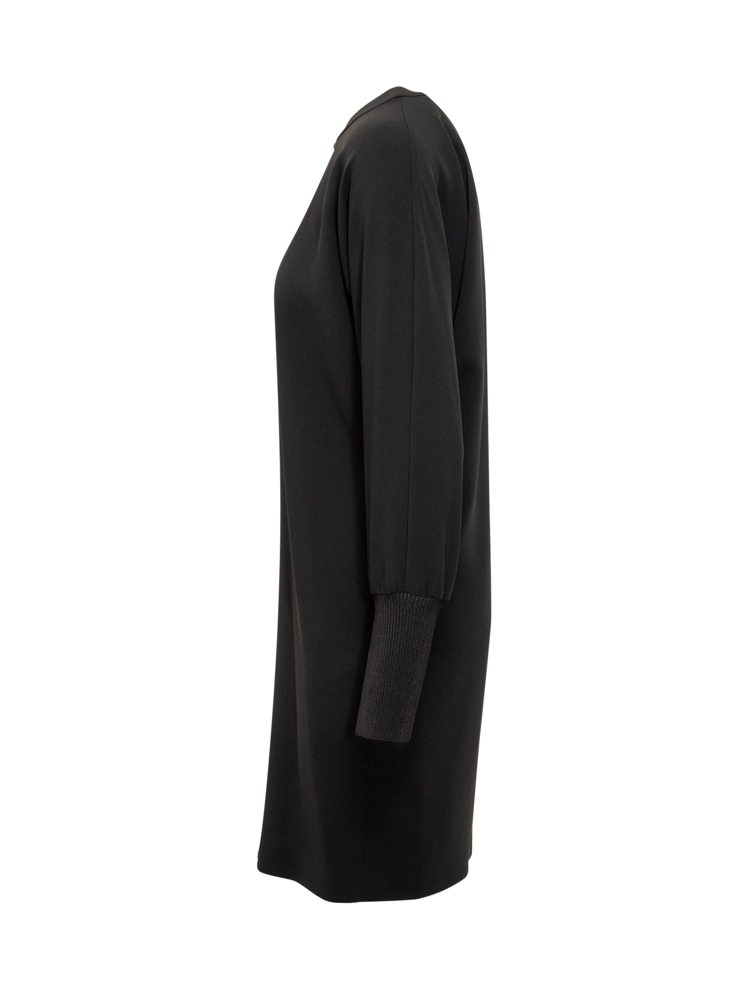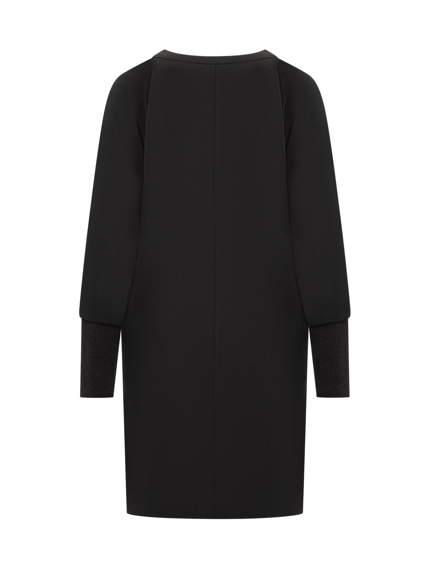 Midi dress with subtle V-neck slit. Ribbed hems. Metal detail at neck.