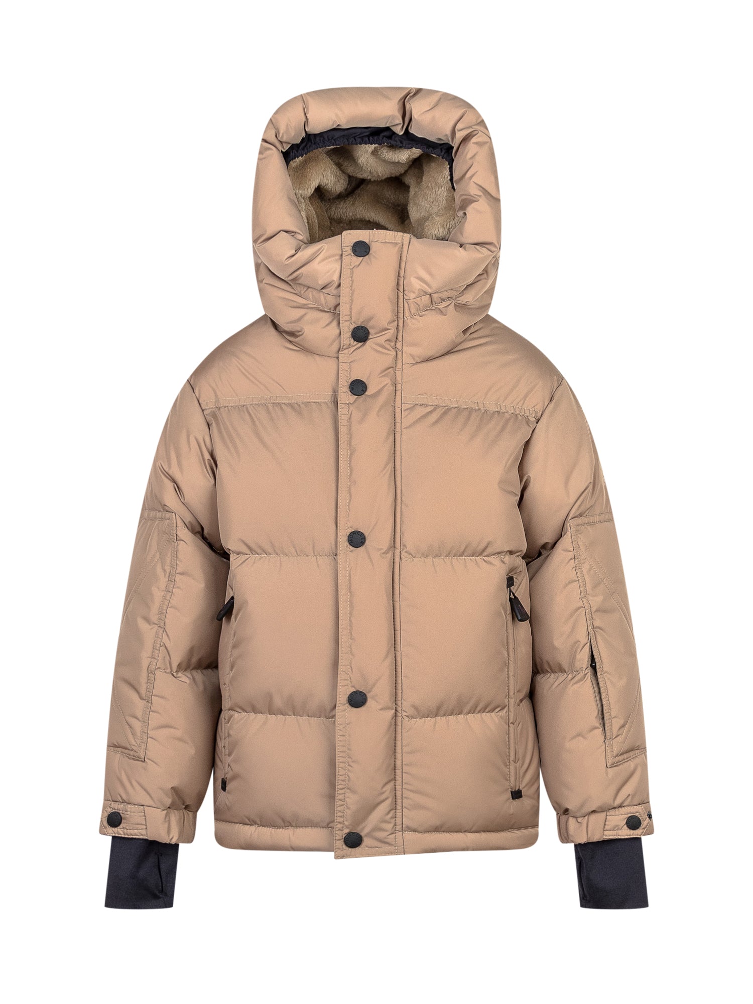 Moncler Kids Kasanka jacket in beige, padded and warm, featuring hood, button closure and hidden zip.