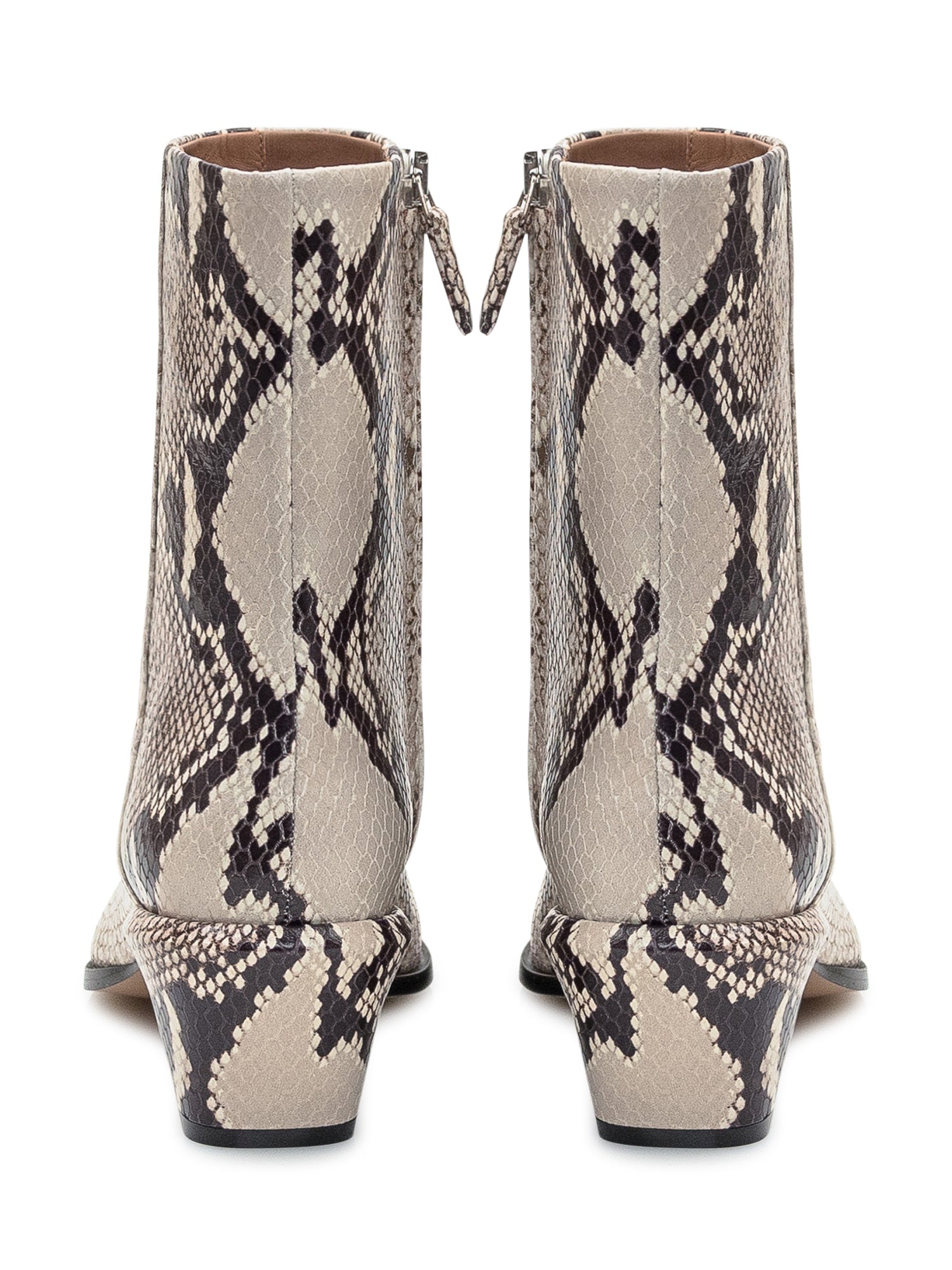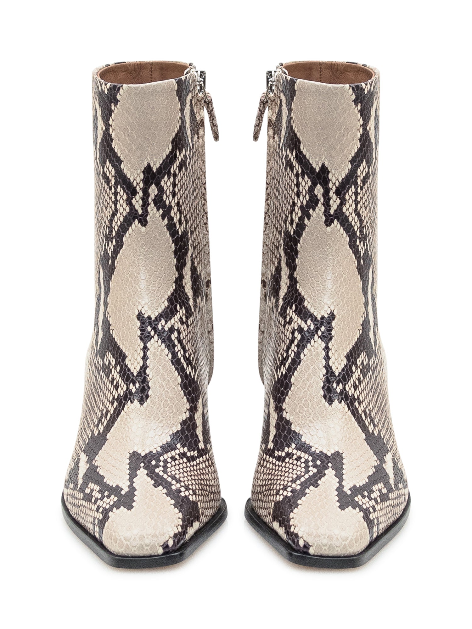 Paris Texas leather ankle boots with beige and black snake print. Pointed toe and mid block.