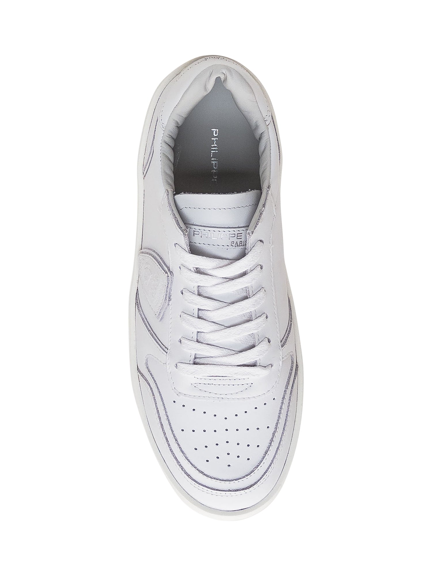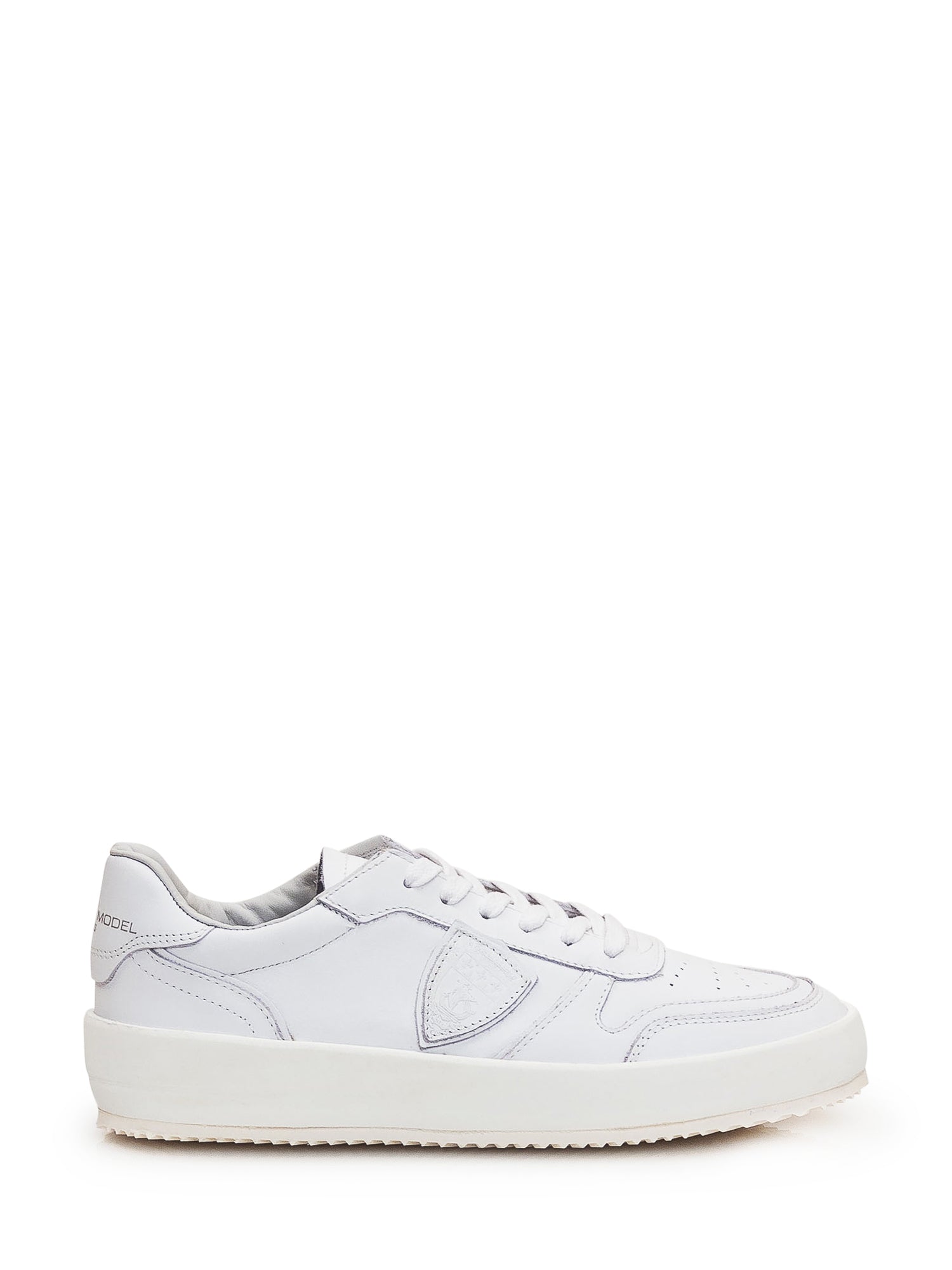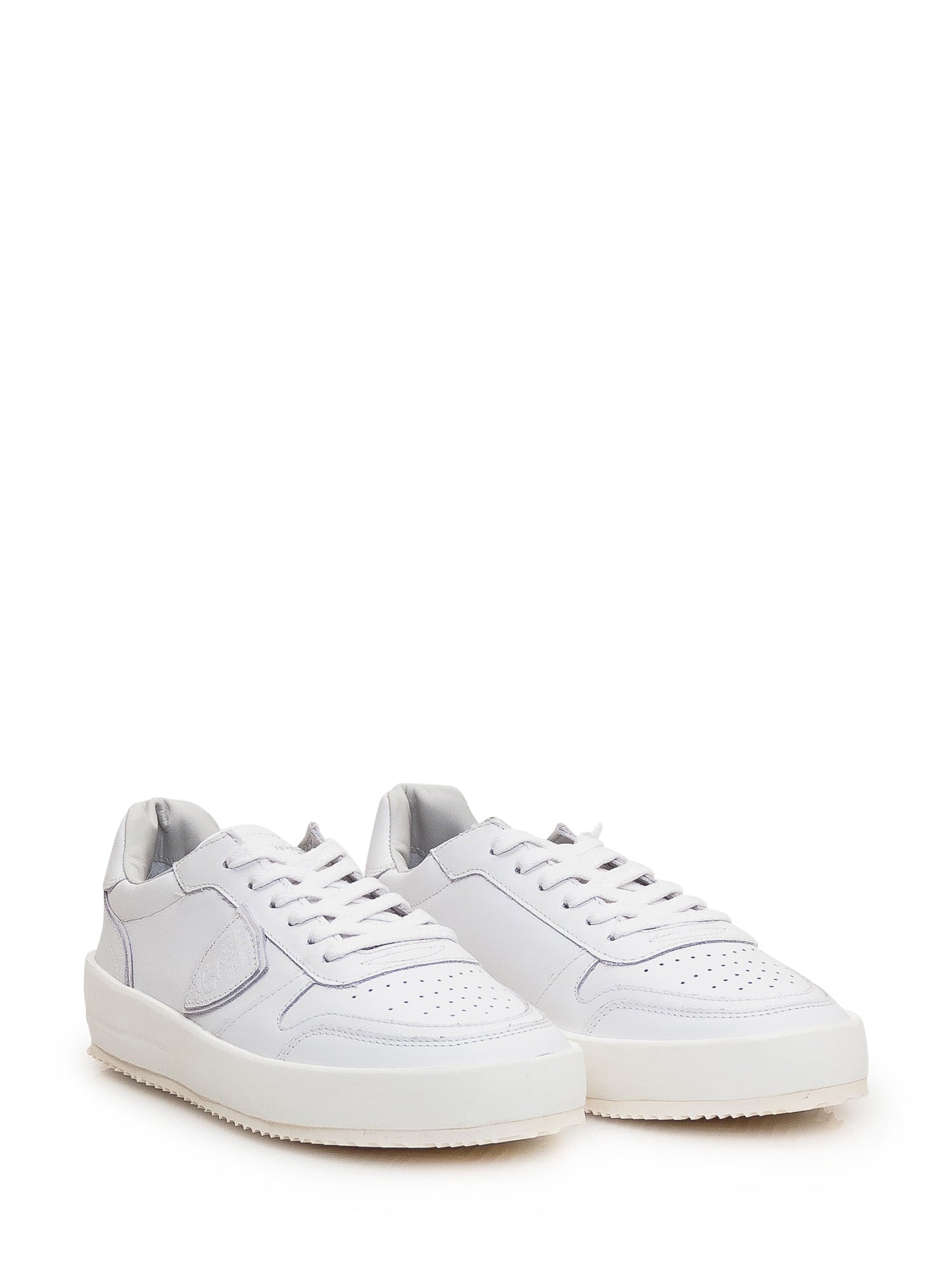 White leather sneaker. Perforated toe. Closure with laces. Logo on tongue and heel. Side leather shield.