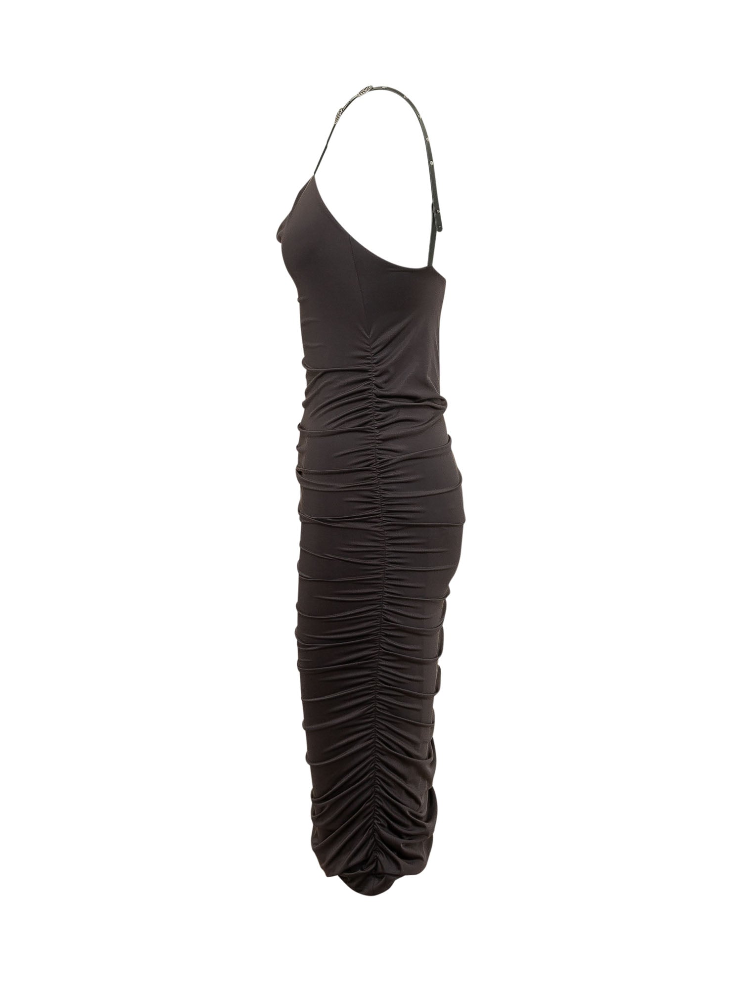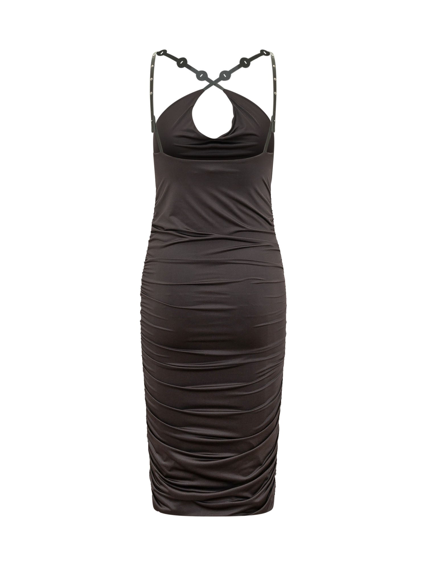 with wide neckline and front opening, thin crossed straps and fitted silhouette