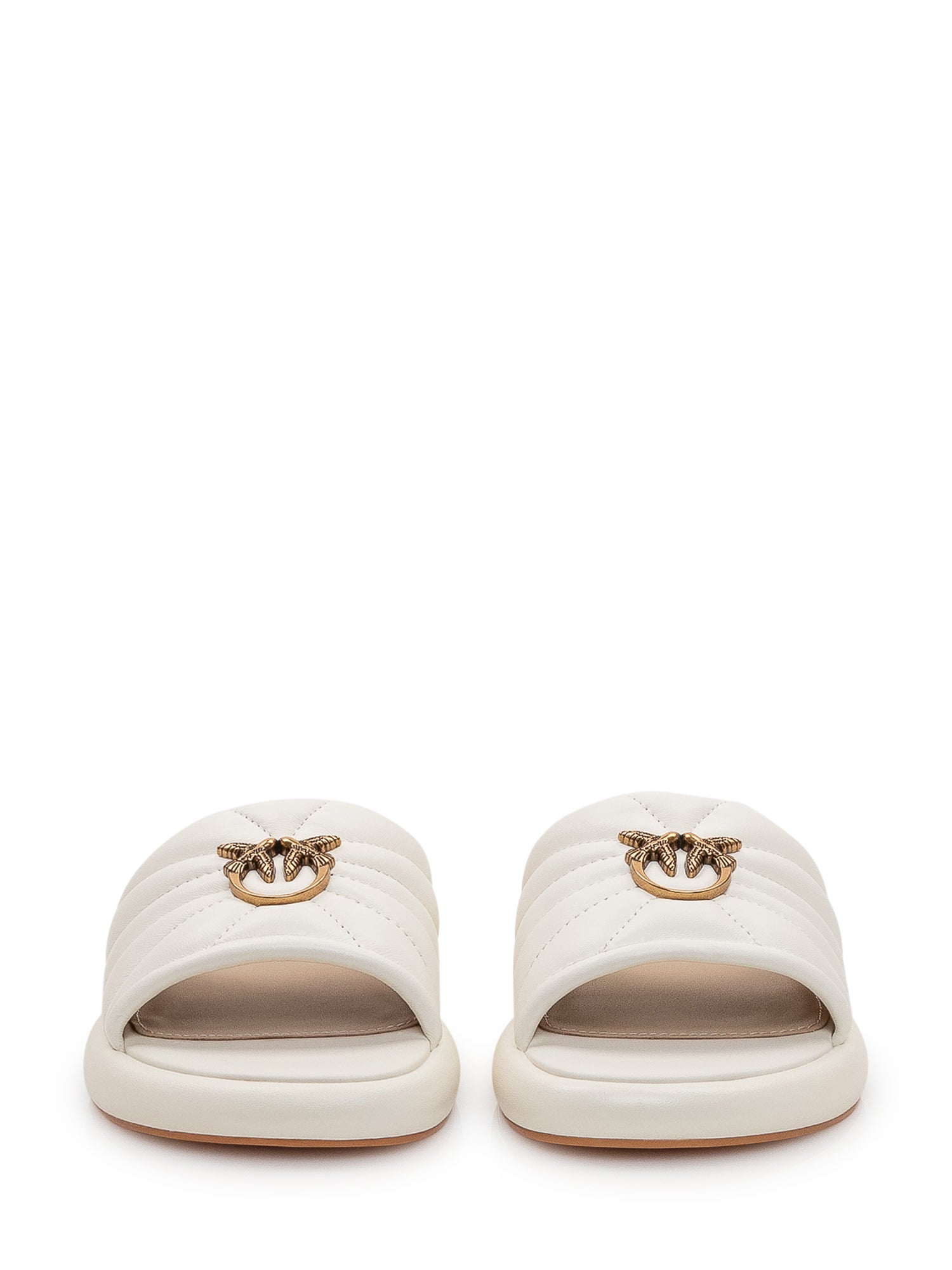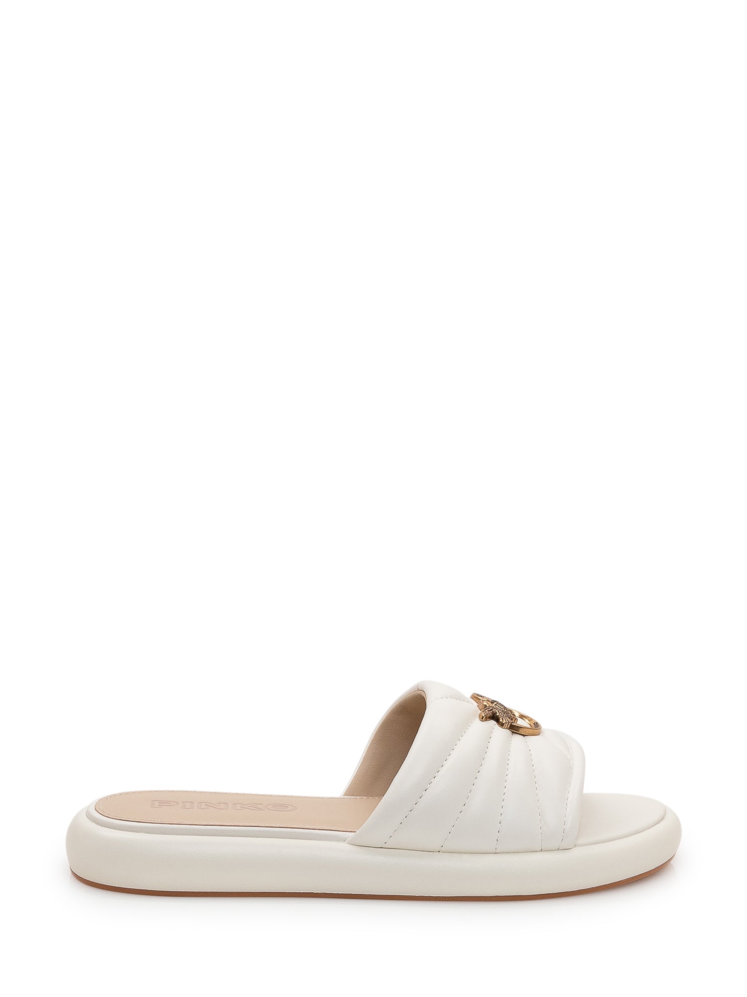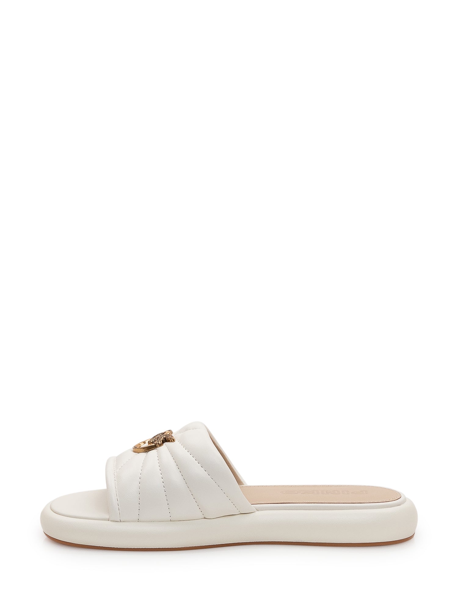 Flat leather sliders featuring a padded, quilted-effect strap and open toe. Embellished with a metal logo appliqué on the upper and a contoured sole for optimal comfort, perfect for a casual yet refined look.
