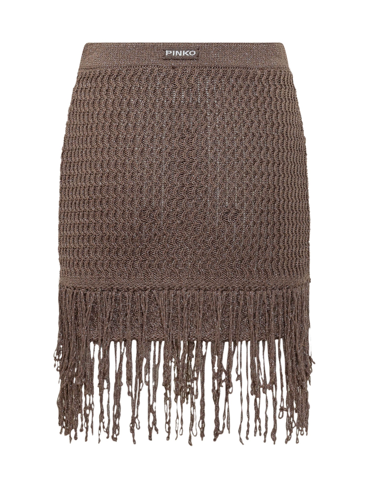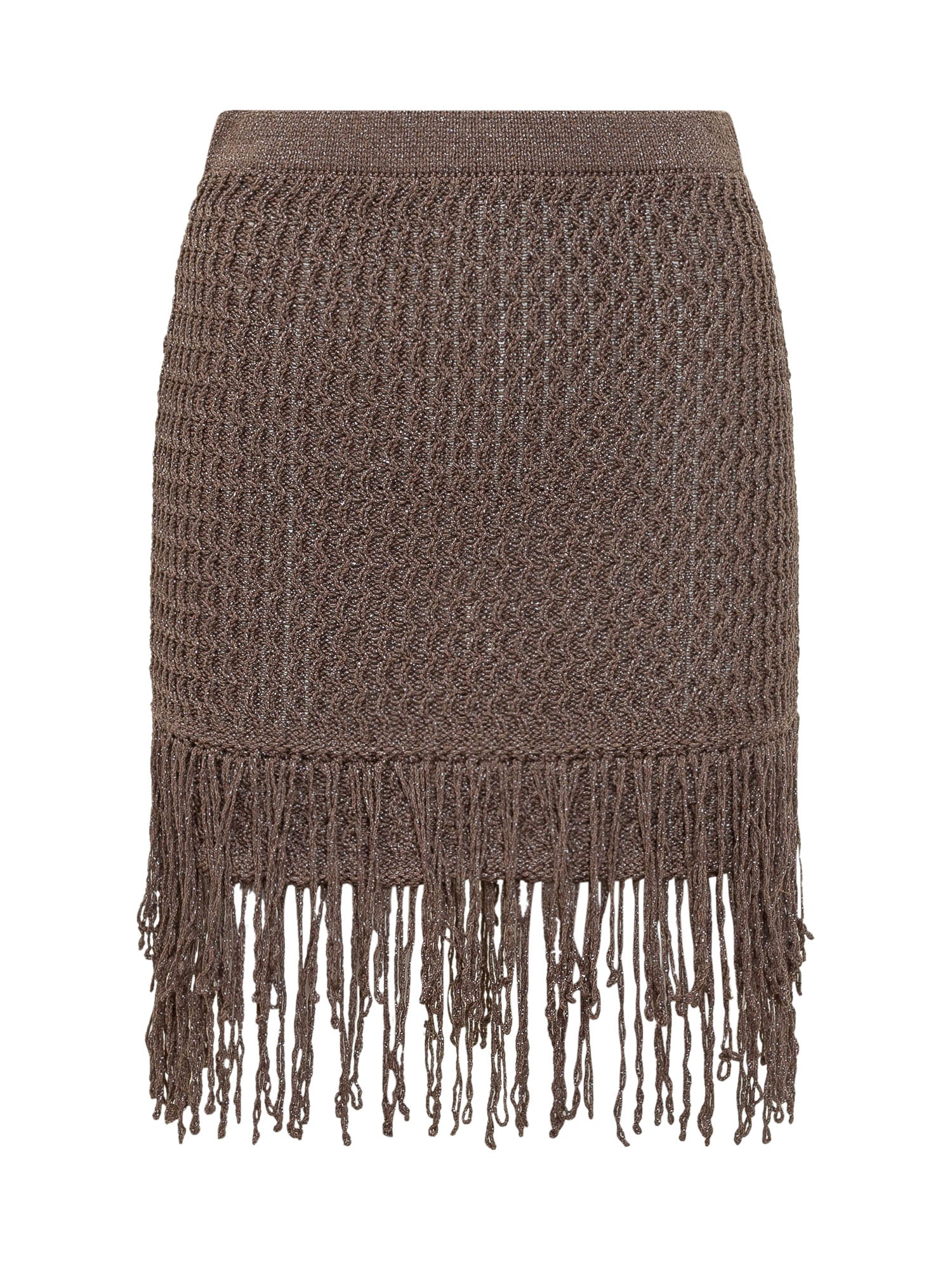with knit texture and mini length, fringe detail at hem and fitted silhouette