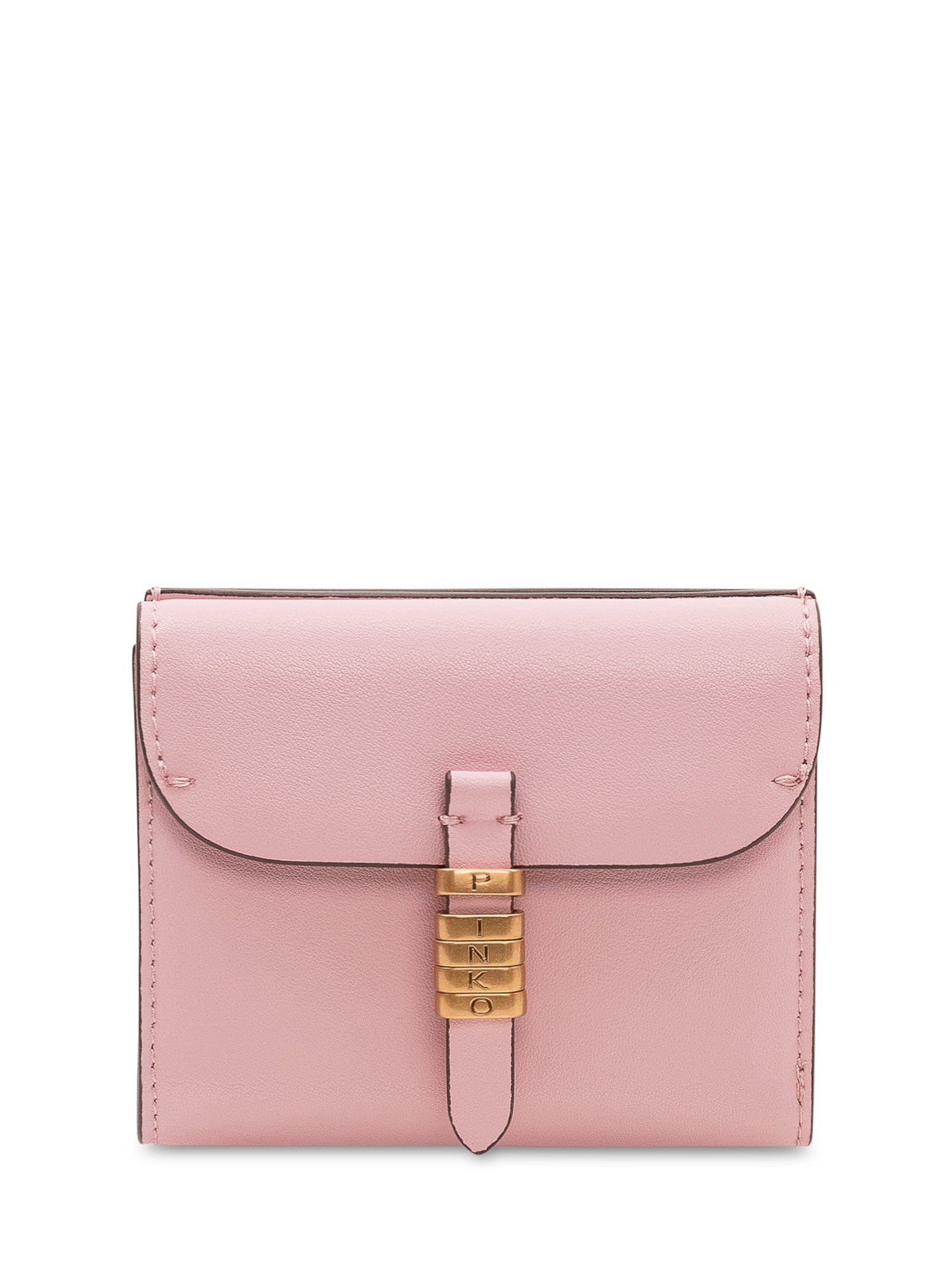 Wallet with flap and front closure with metal element, compact structure and clean design