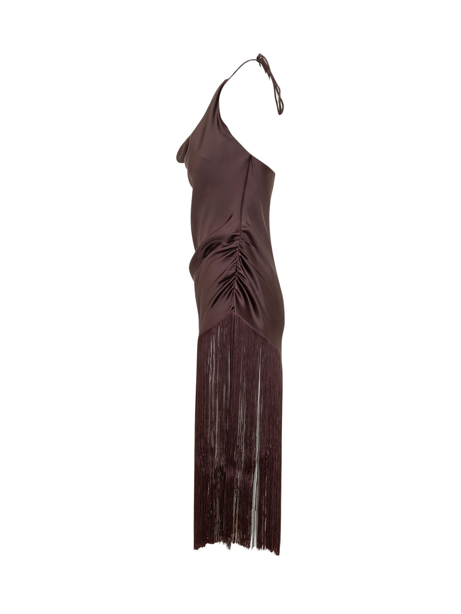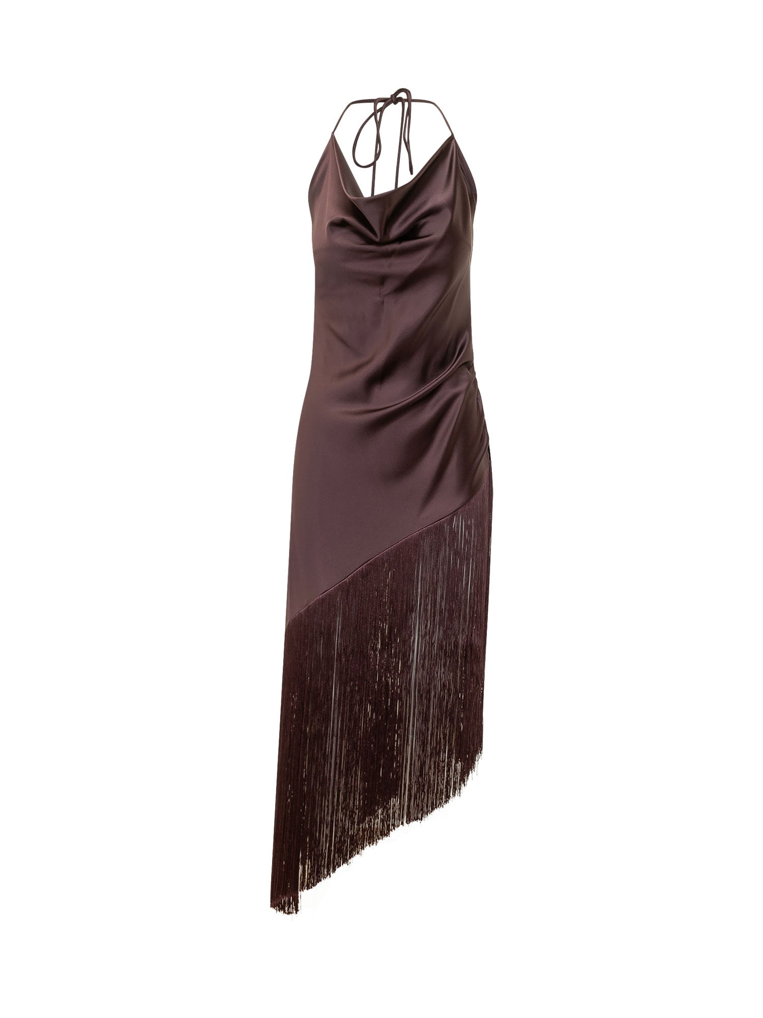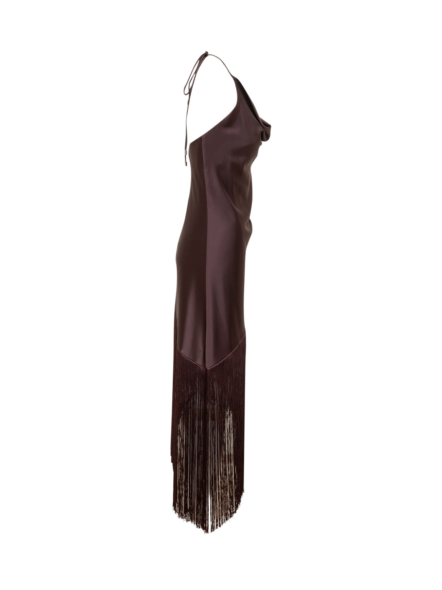 Top with thin straps and draped neckline. Fitted silhouette with asymmetric cut and fringe detail at the hem. Elegant and refined design.