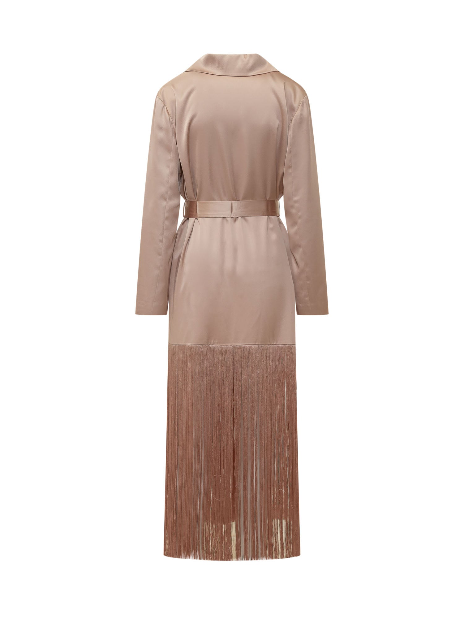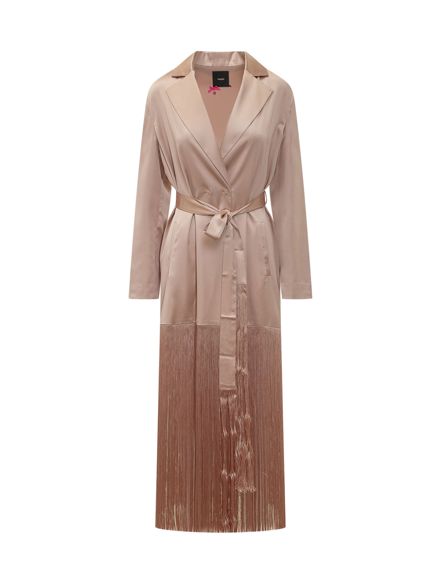 Trench with classic lapels and waist belt closure. Long sleeves and side pockets. Fringe detail along the hem for a distinctive touch.