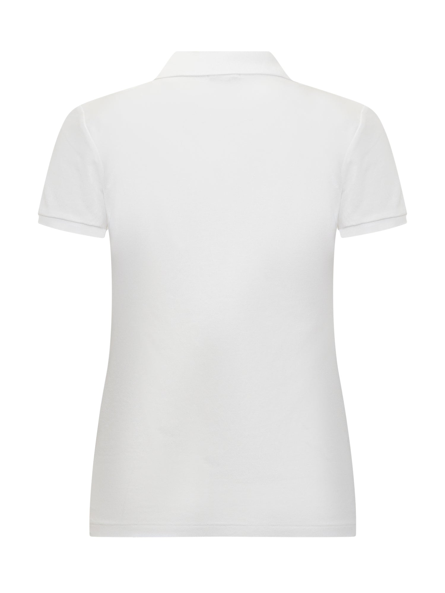 Women's slim-fit cotton piqué polo with classic collar, button placket, and signature embroidered logo.