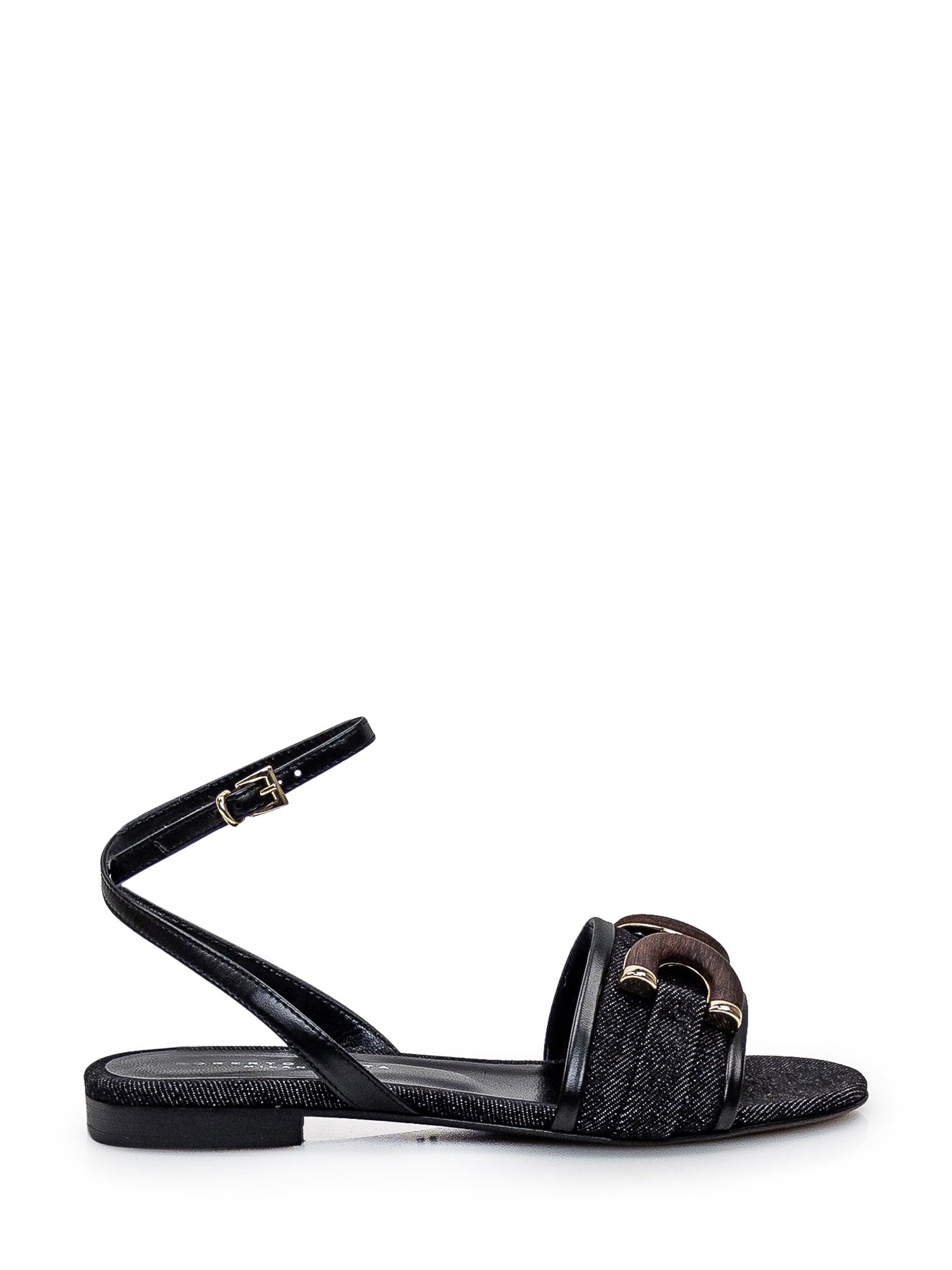 Black denim sandal. Adjustable strap. Mask with wooden accessory on the front. Logo on the insole.