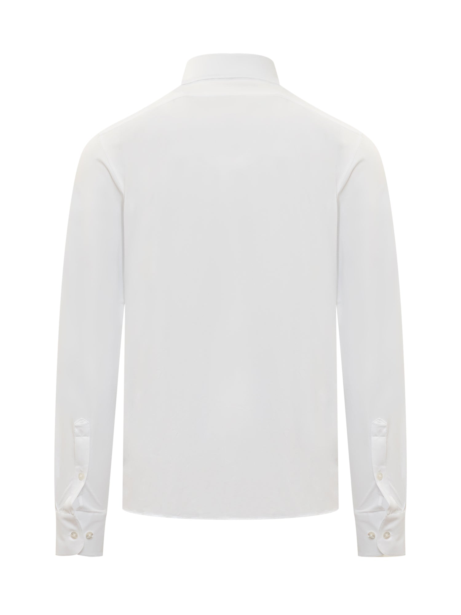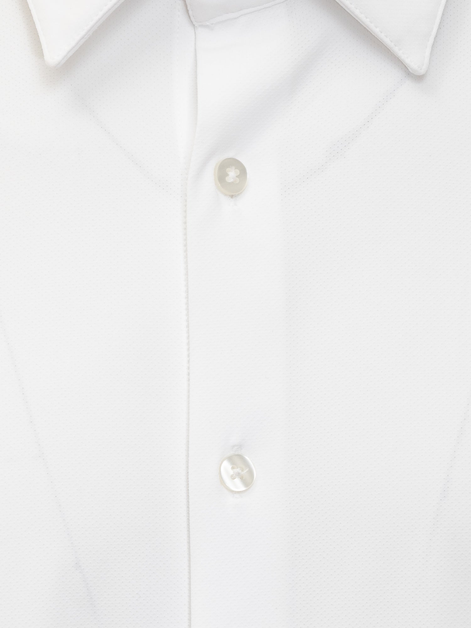 White shirt. Long sleeves. Pointed collar. Button closure. Buttons on cuffs.