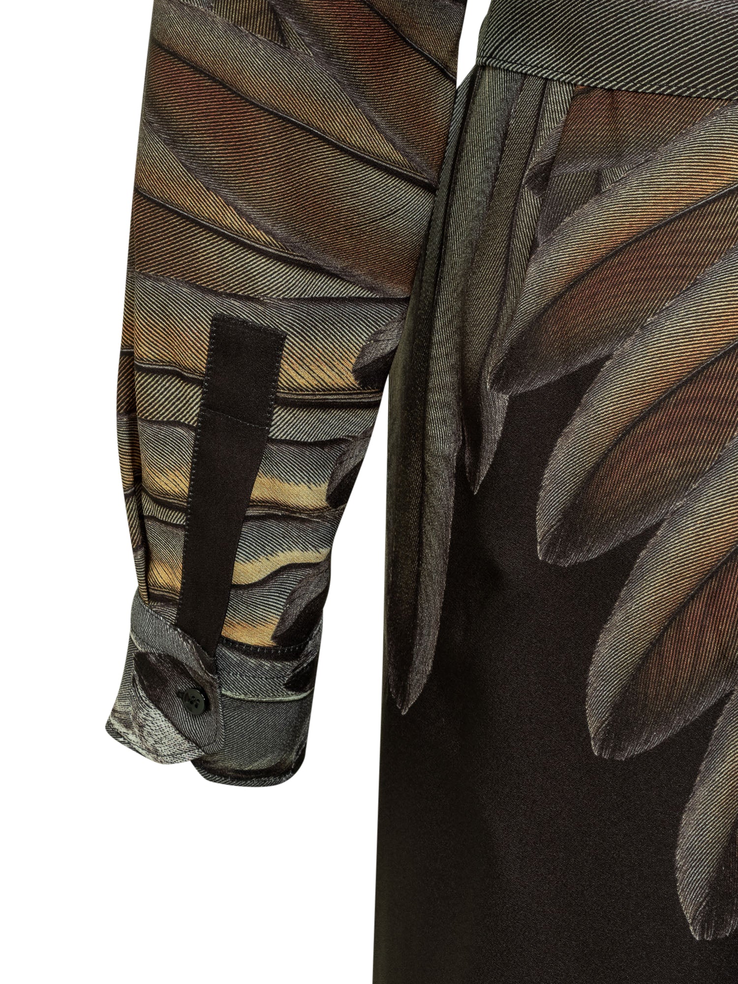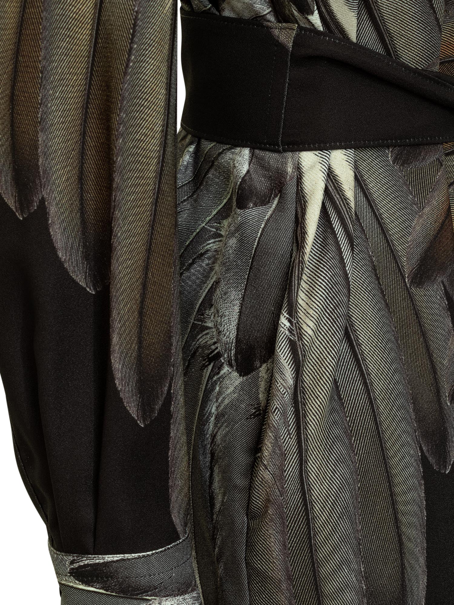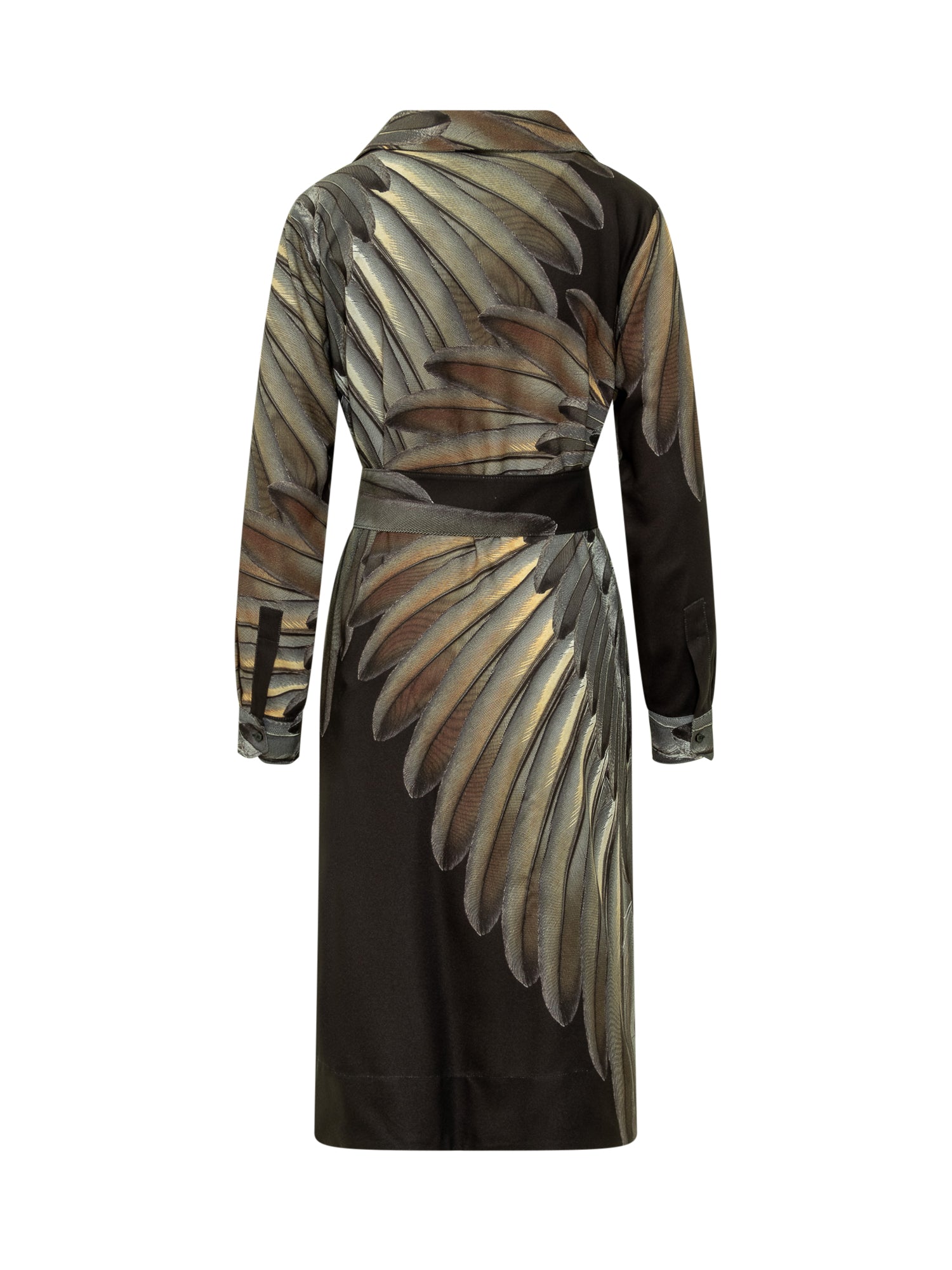 Long-sleeved midi dress. Classic collar with V neckline. Waist belt. Cuffs with button. Feather pattern all over.