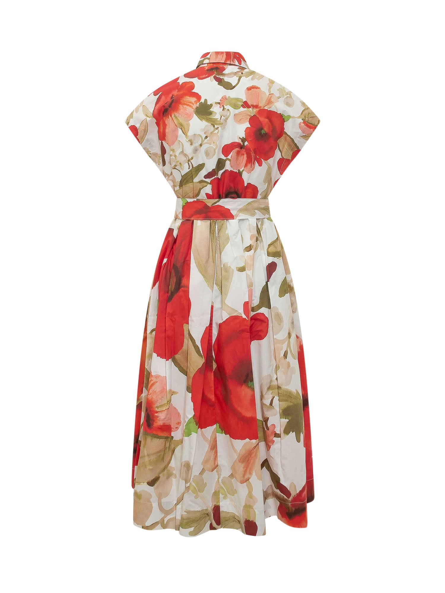 Midi dress featuring a vibrant floral print, designed with a classic collar, wide short sleeves, and a front button closure. The matching waist belt enhances the silhouette while the flowing skirt adds movement and elegance, making it perfect for refined daytime or occasion looks.