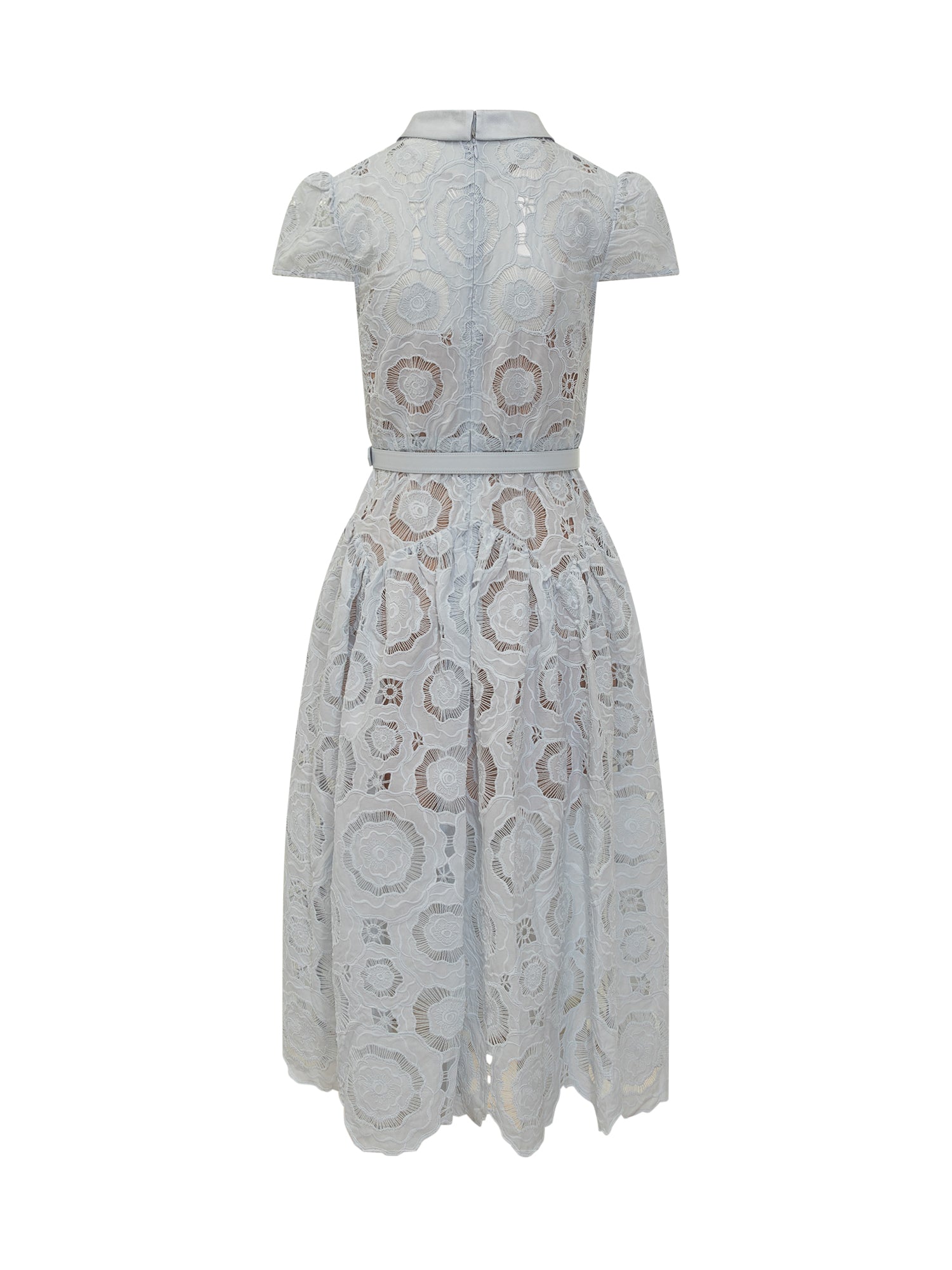 Midi dress in floral lace featuring short sleeves and a waist belt for a defined shape. The structured collar adds a modern twist to its romantic.
