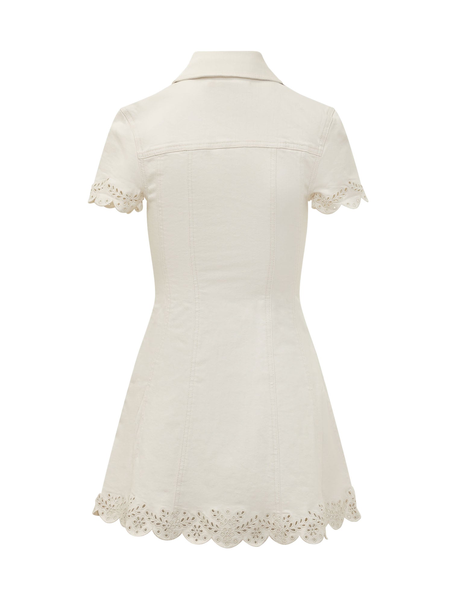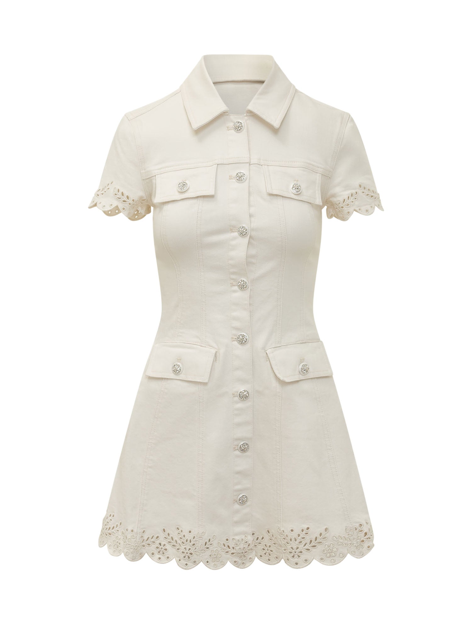 Women s ivory mini dress featuring a classic collar, short sleeves and a front closure with decorative jewel buttons. The structured design enhances the silhouette, while broderie detailing on the sleeves and hem adds an elegant and feminine touch, perfect for refined summer looks or chic daytime outfits.