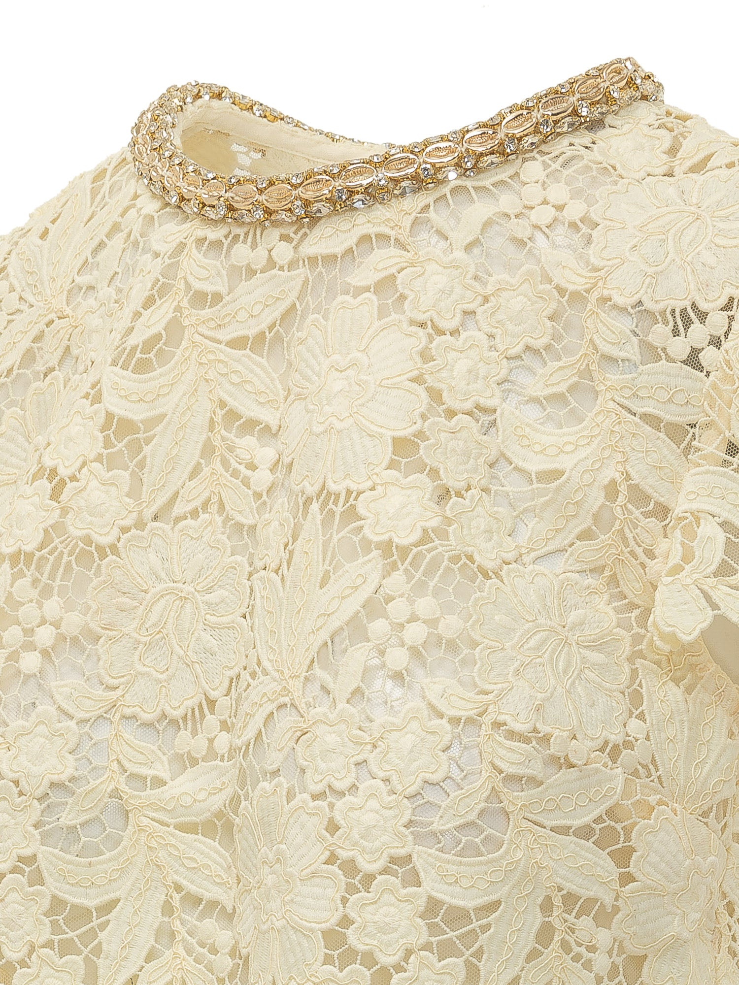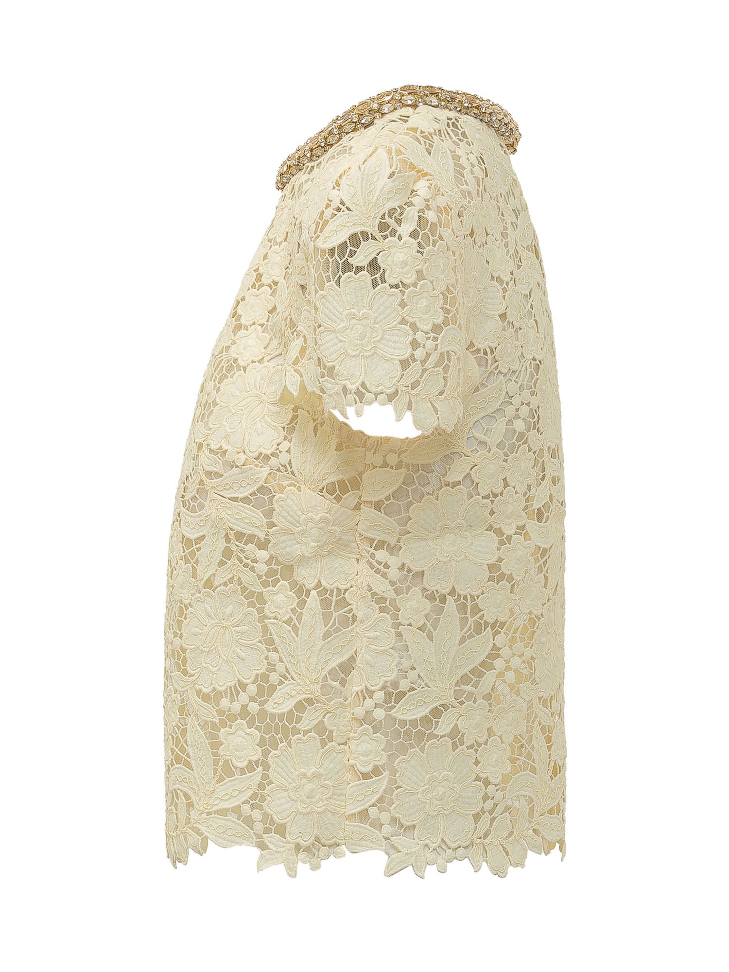 Elegant women s beige lace top with short sleeves and a refined embellished jewel neckline. The floral design and soft silhouette make it perfect for elegant outfits or special occasions.