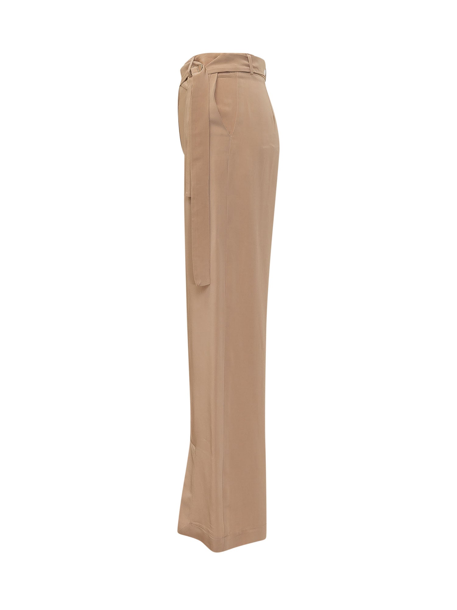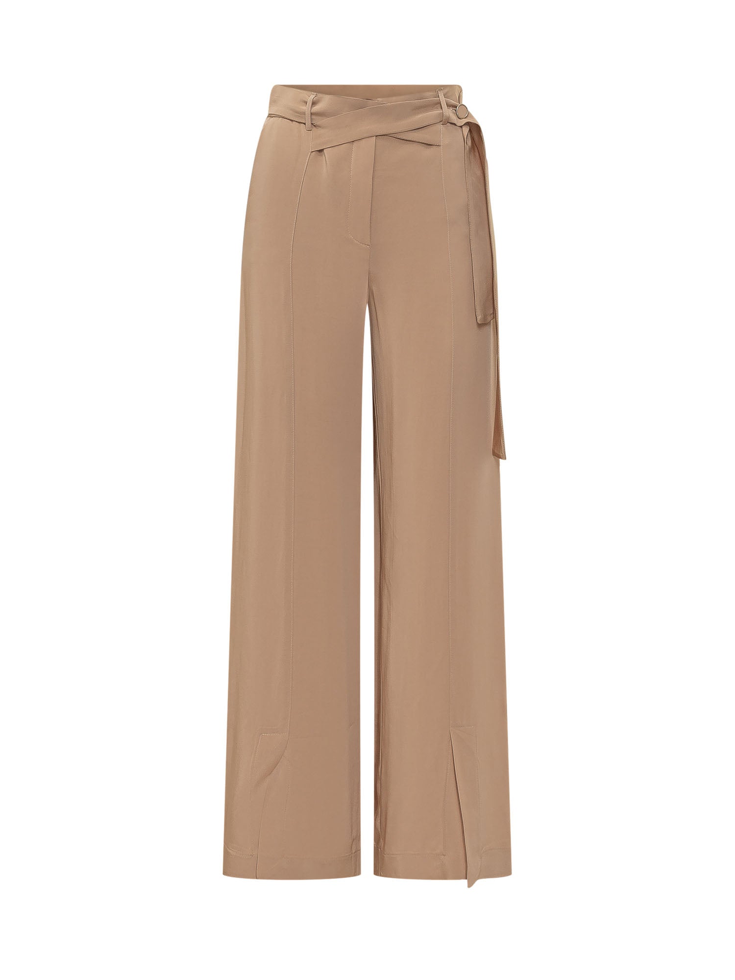 Long pants with wide leg, featuring integrated belt with loops and front closure, vertical seam details and hem slits