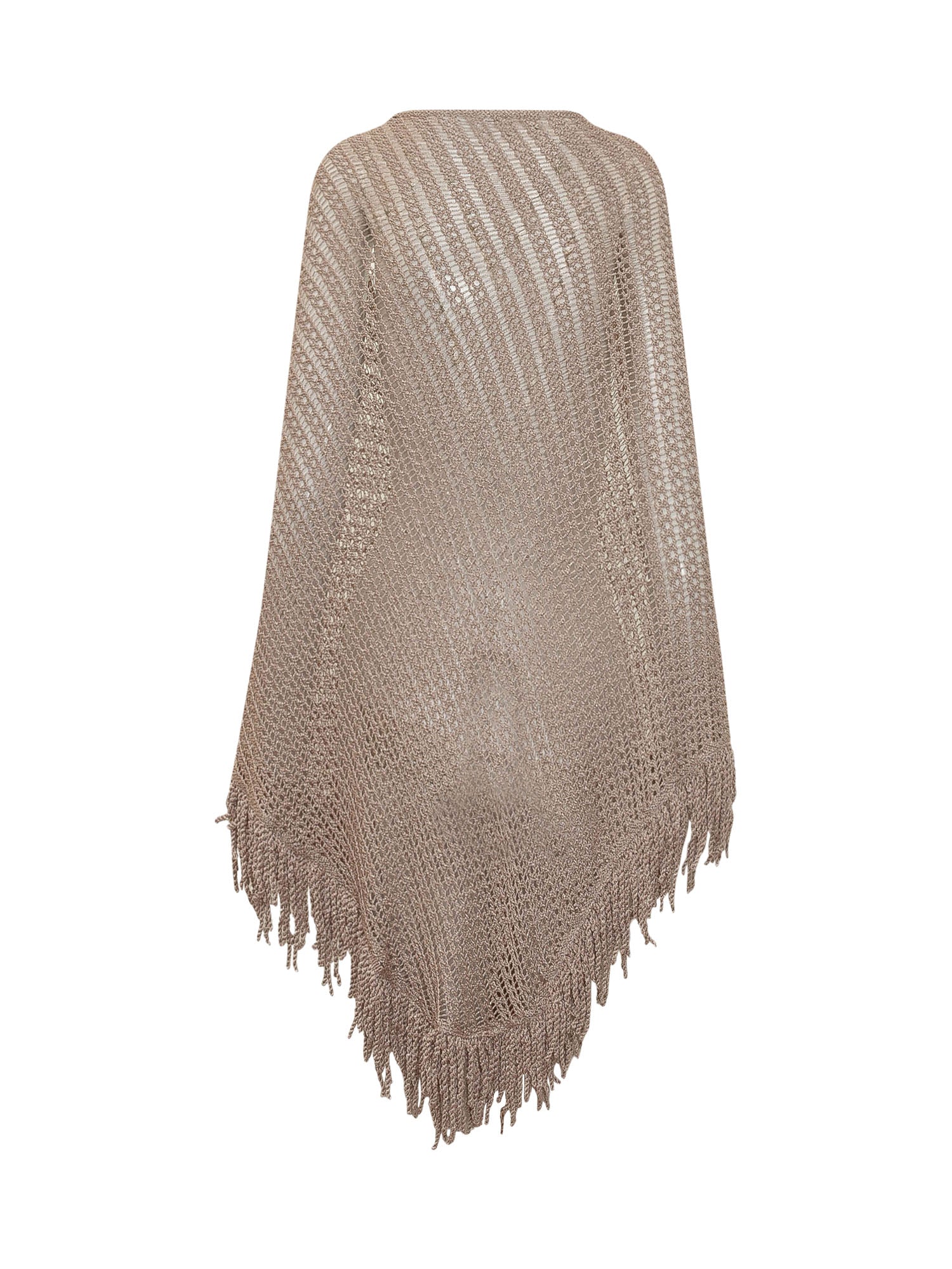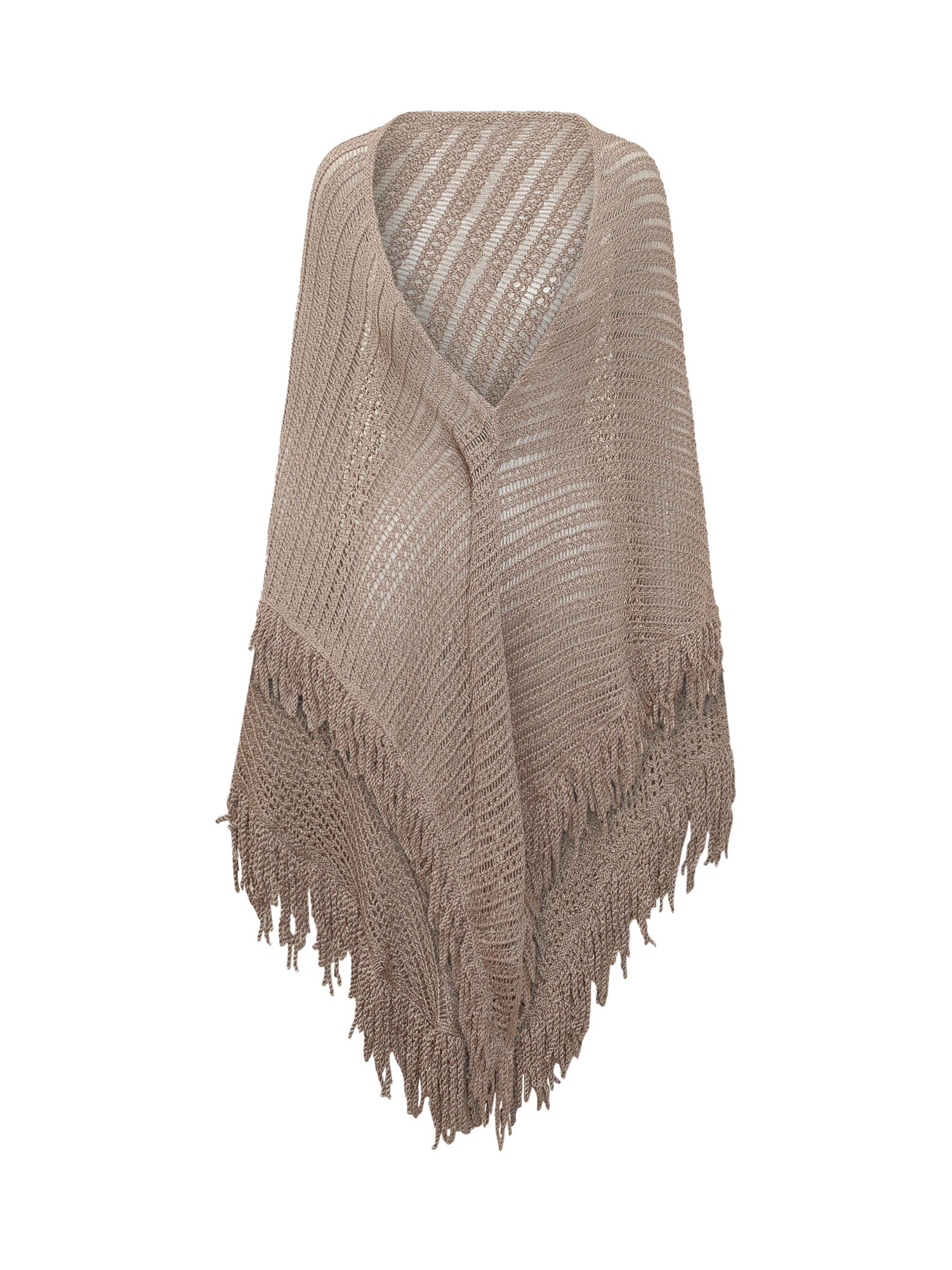 Knit shawl crafted from soft openwork knit that adds lightness and movement. The design features a wide, enveloping silhouette enhanced by decorative fringe along the edges. Perfect for completing both elegant and casual looks with a refined touch.