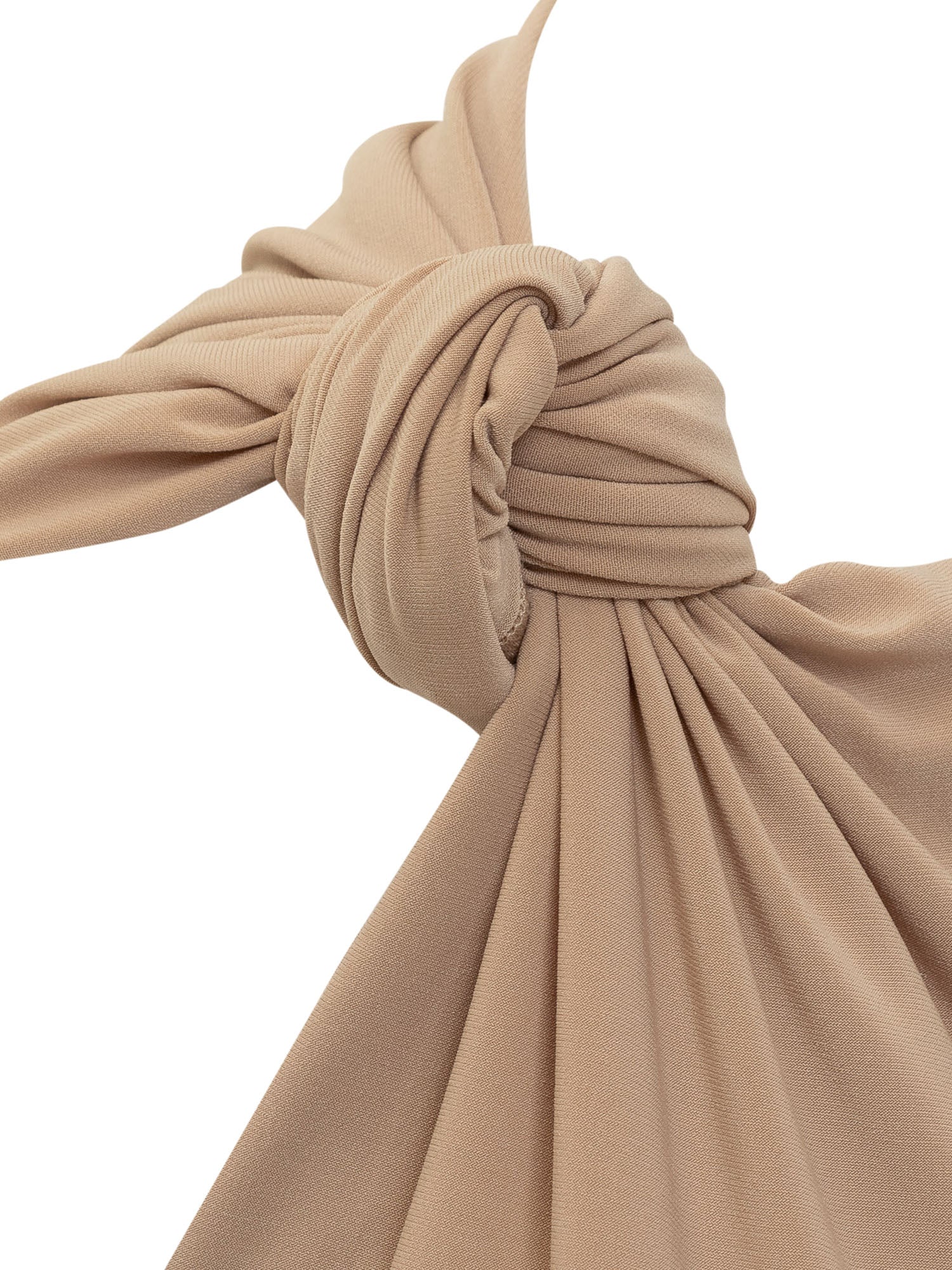 Sleeveless long dress. Crew neck. Bow at the shoulder.