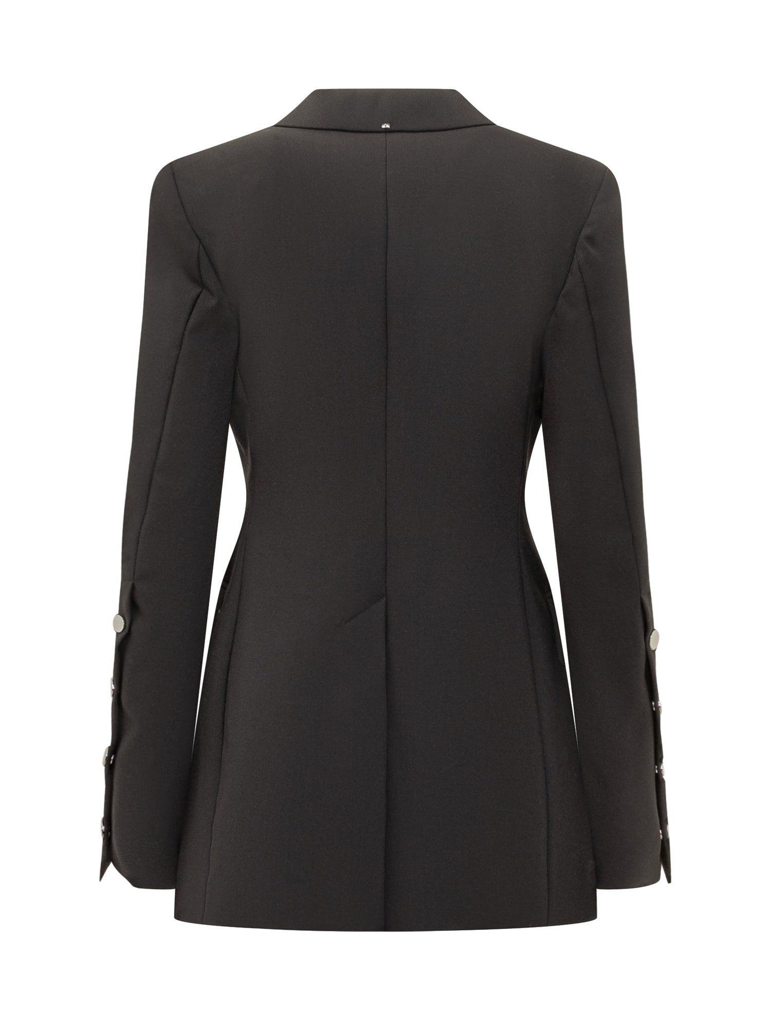 Sportmax black single-breasted blazer with one-button closure and flap pockets.