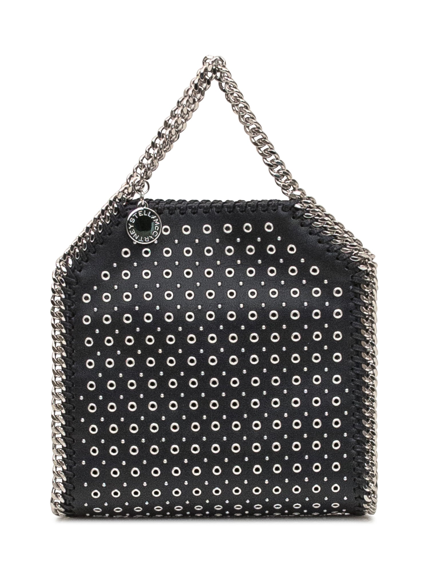 Stella McCartney Falabella Tiny bag in black with all-over silver studs, gunmetal chain trim, and whipstitch detailing.