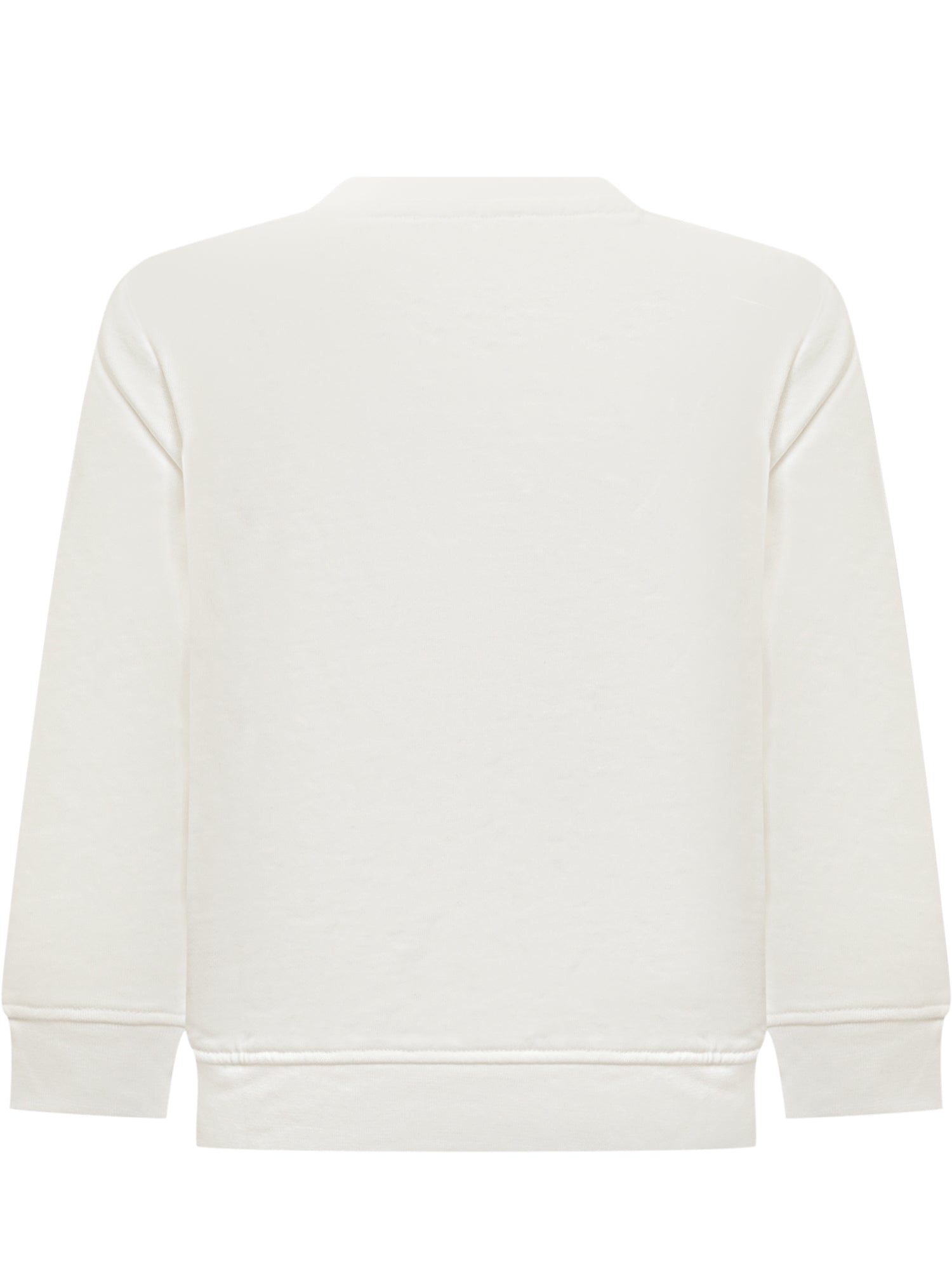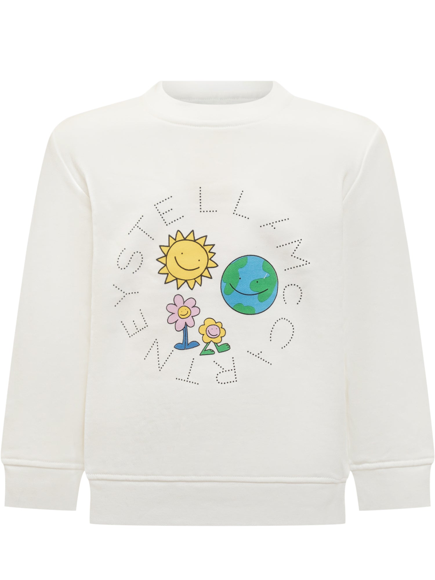 White sweatshirt for girls by Stella McCartney Kids, featuring a cute print of a smiling sun, Earth, and cheerful flowers, framed by the brand's name.
