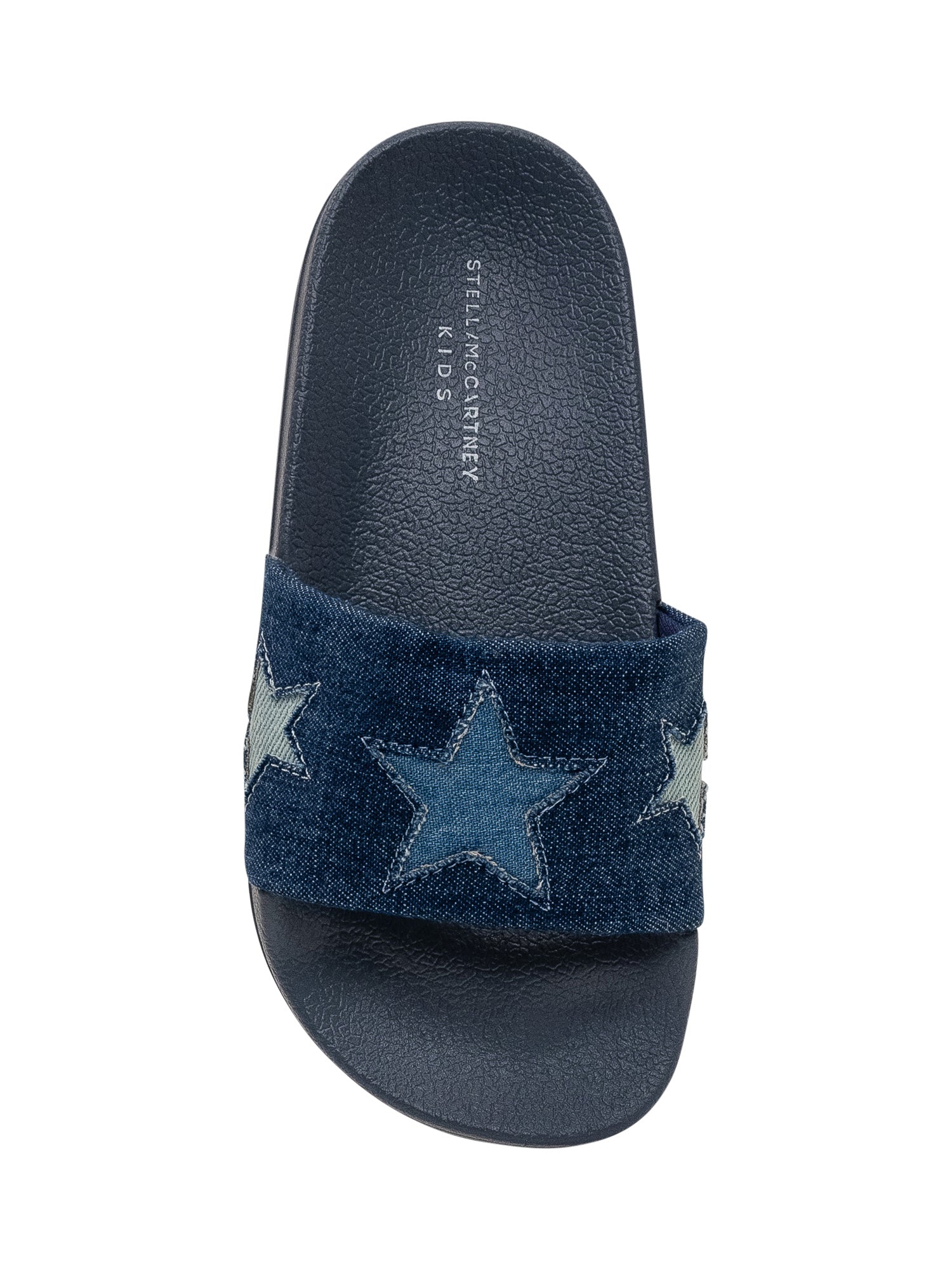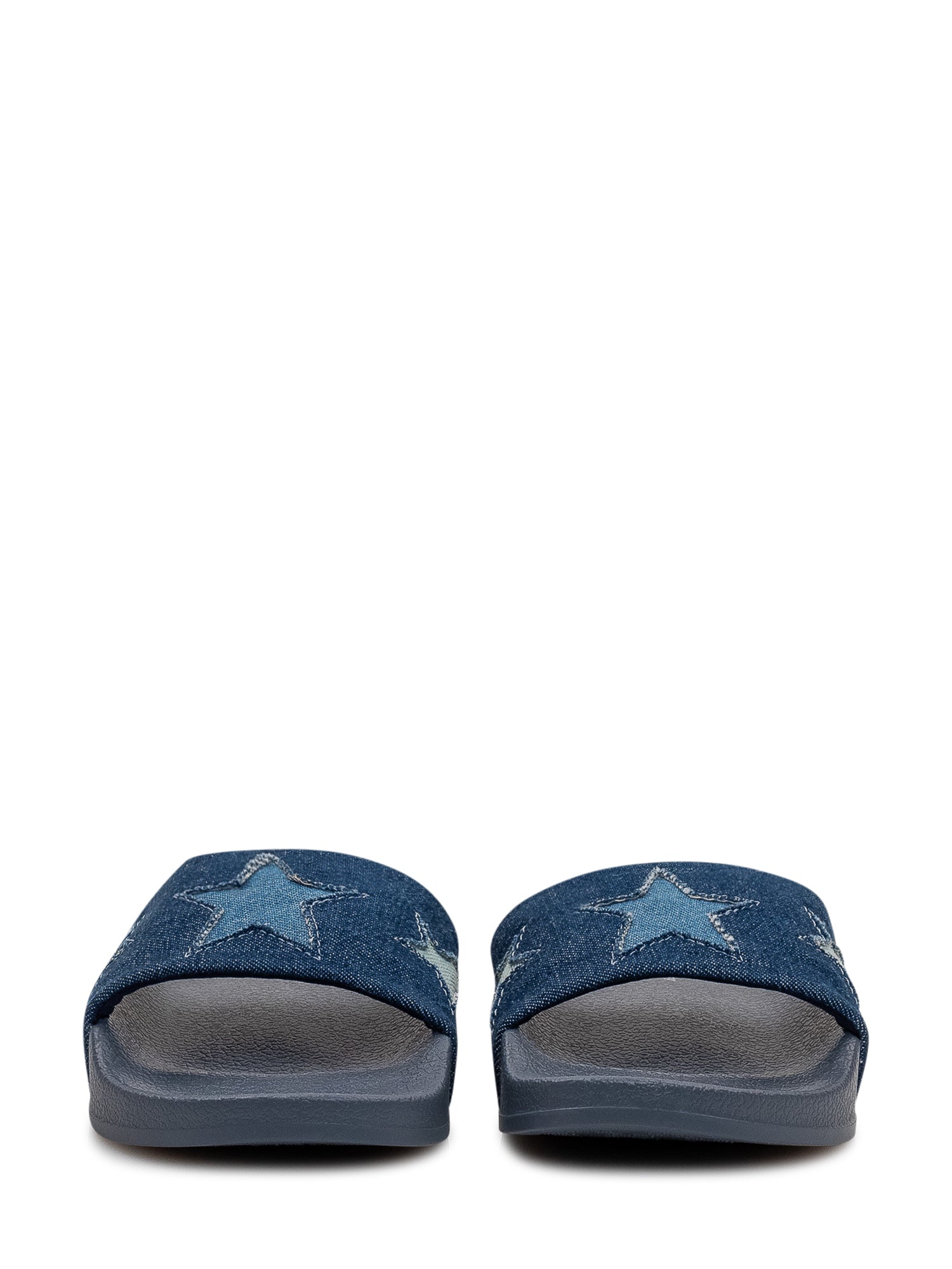 Slide sandals featuring a denim strap embellished with contrasting star appliqués. Flat sole in lightweight and durable material, ideal for everyday comfort. Casual and versatile design, perfect for the summer season.
