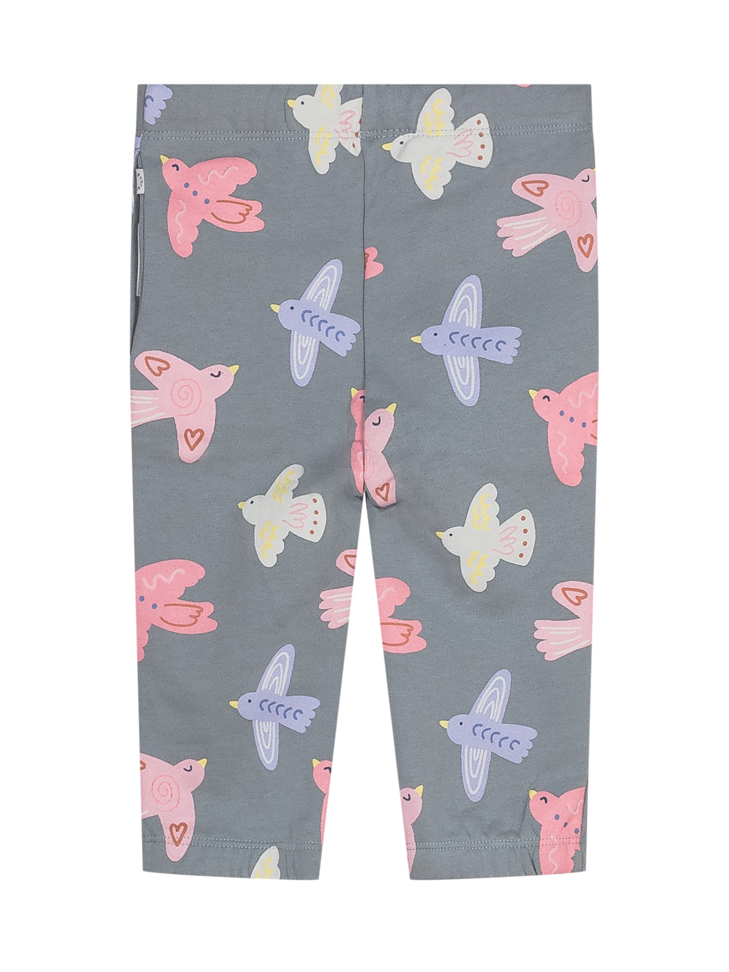 Grey stretch cotton leggings by Stella McCartney Kids featuring colorful bird print. Elastic waistband with drawstring for a comfortable fit.