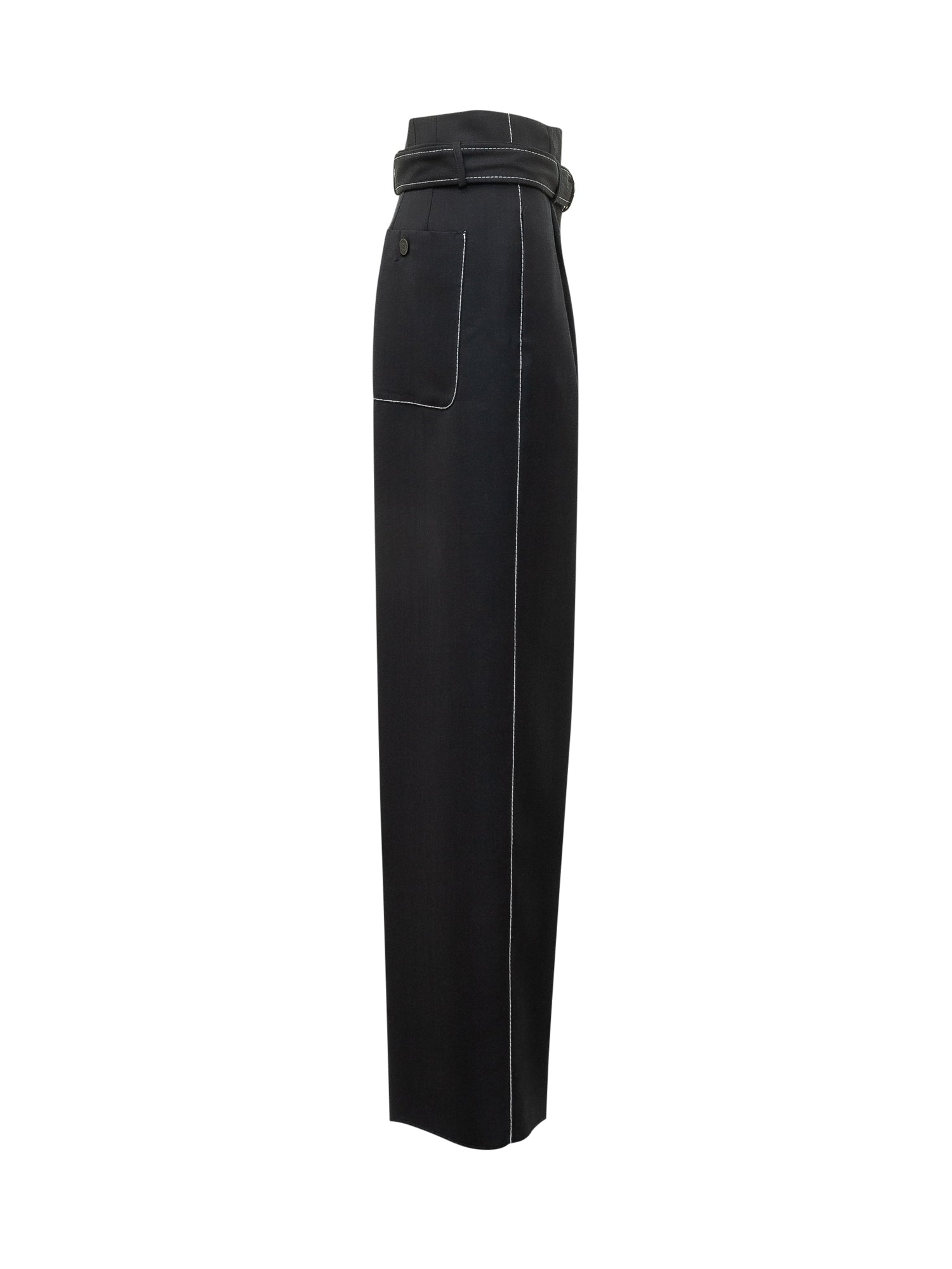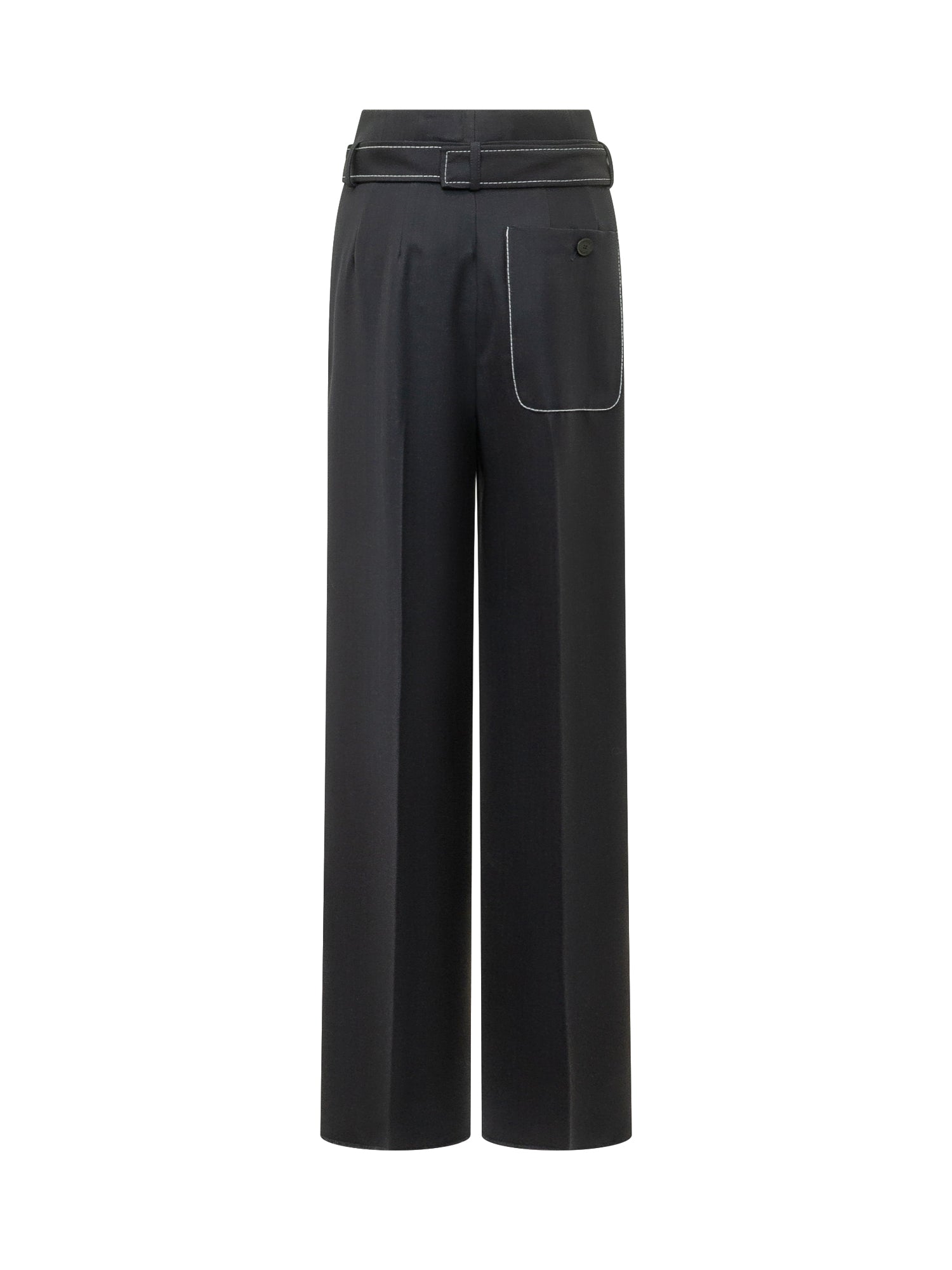 Pants with matching belt and metal buckle. Front closure and straight leg with pressed crease for a refined defined look.
