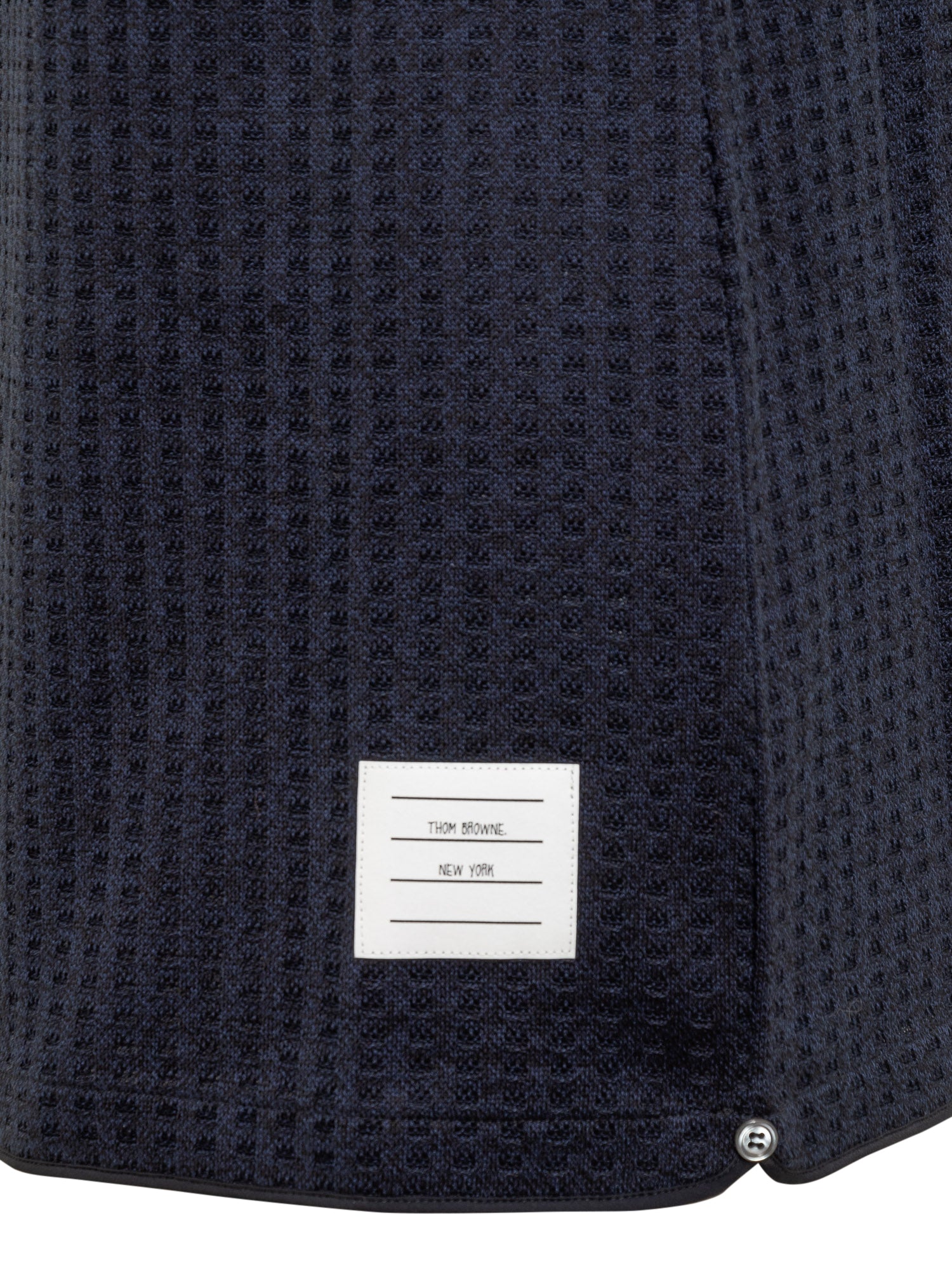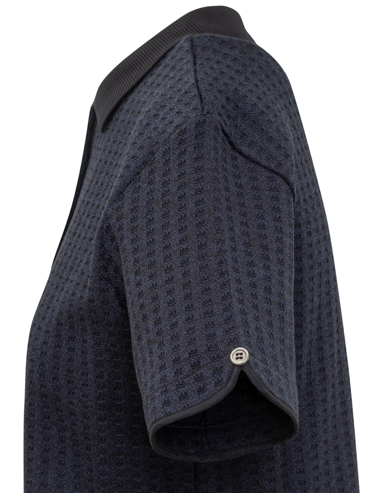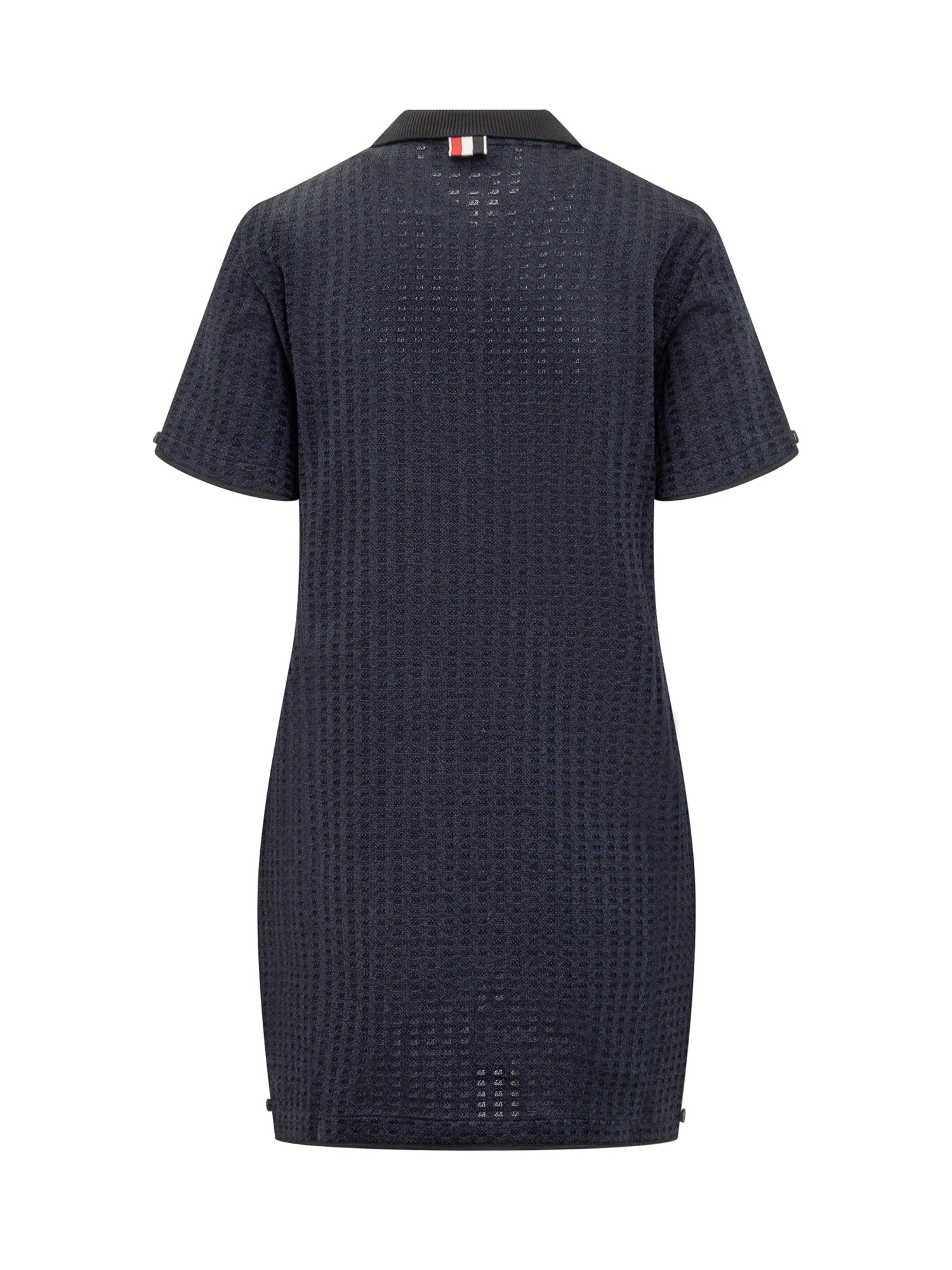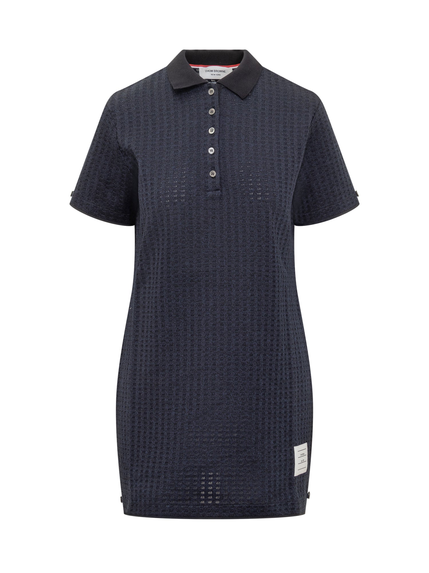 Polo-style midi dress in cotton knit with vichy-effect jacquard work. Classic ribbed collar. Button closure. Decorative buttons on sleeves and bottom. Tri-color grosgrain tab at back. Logo patch on the front.