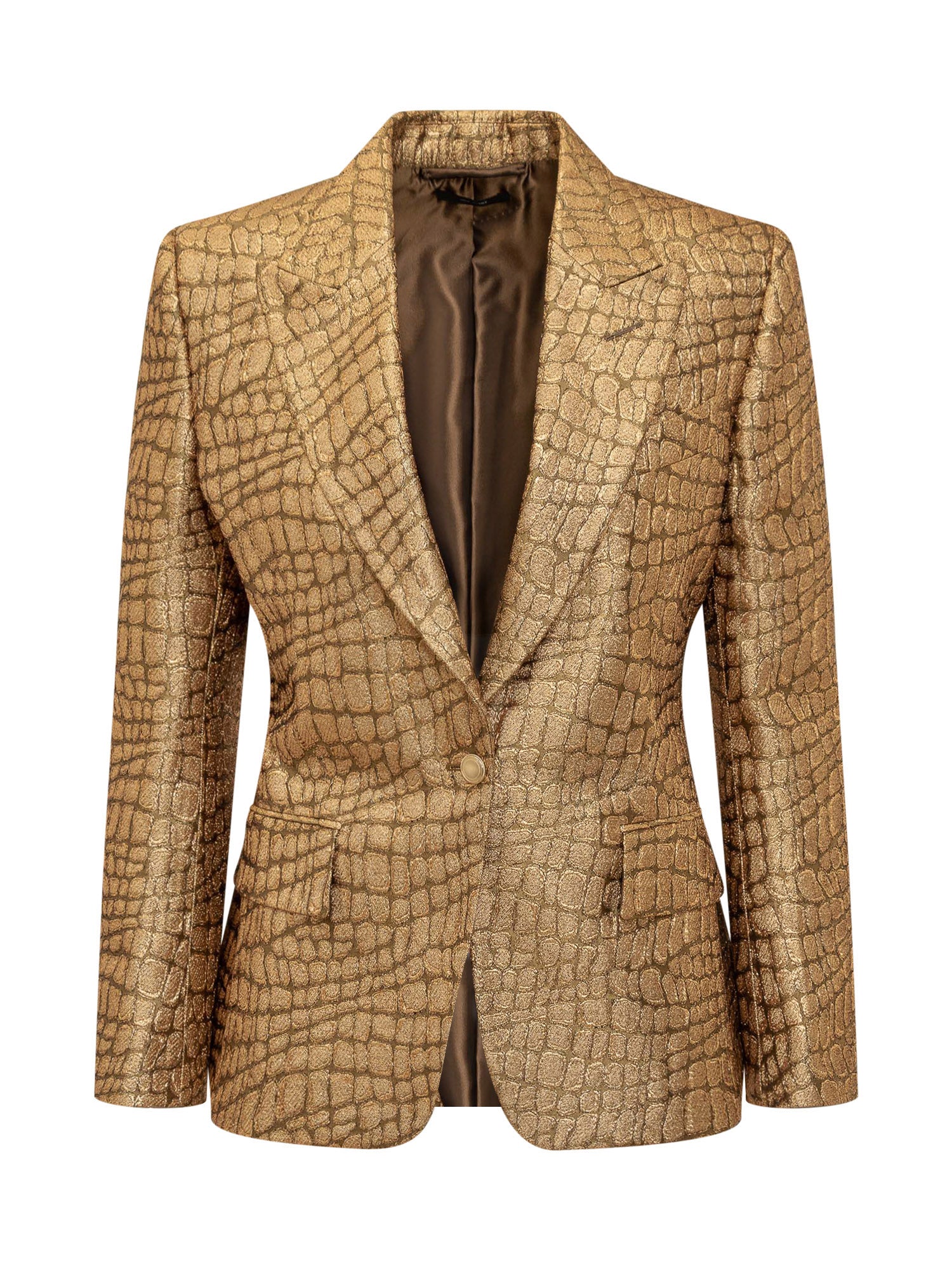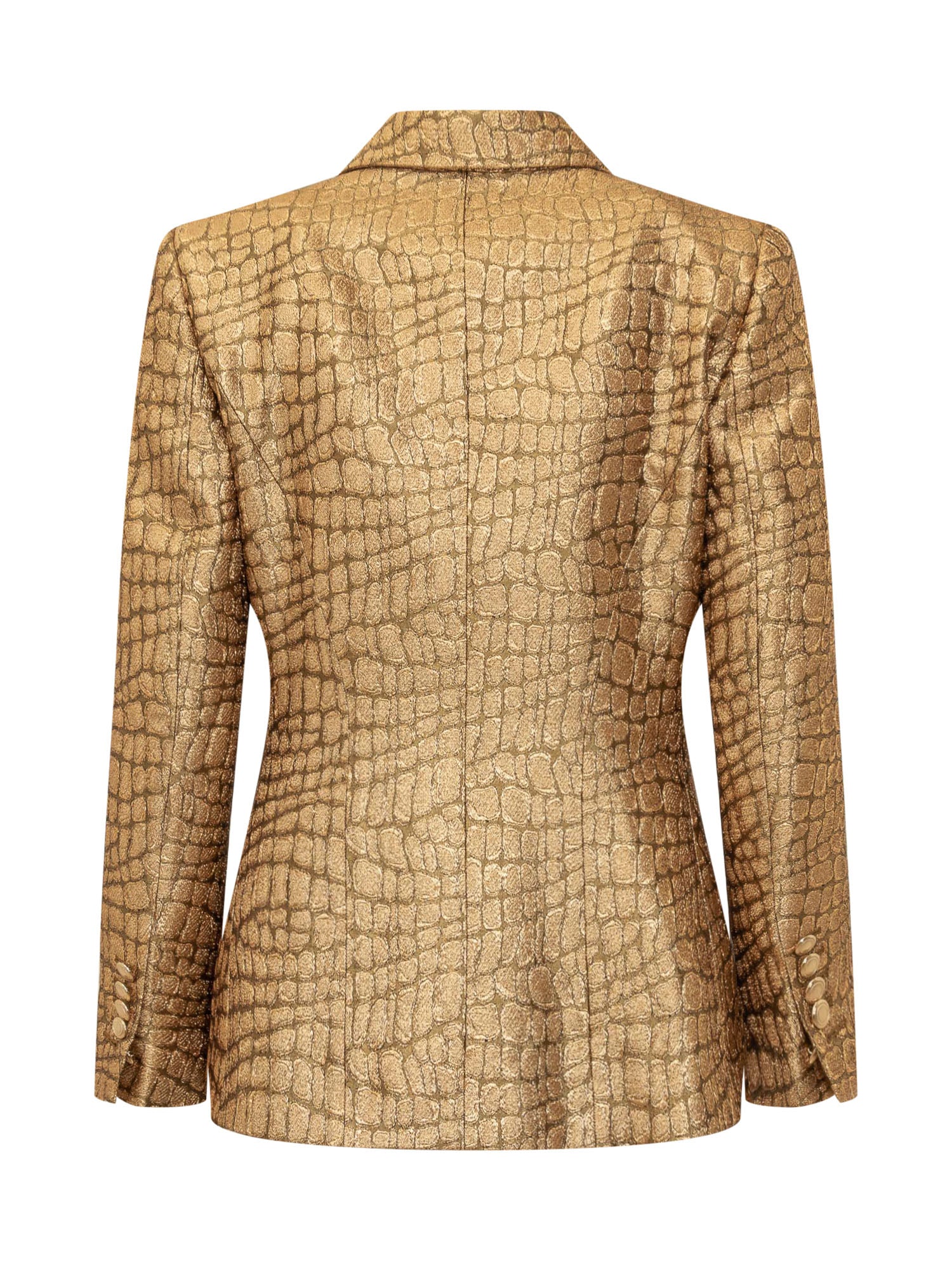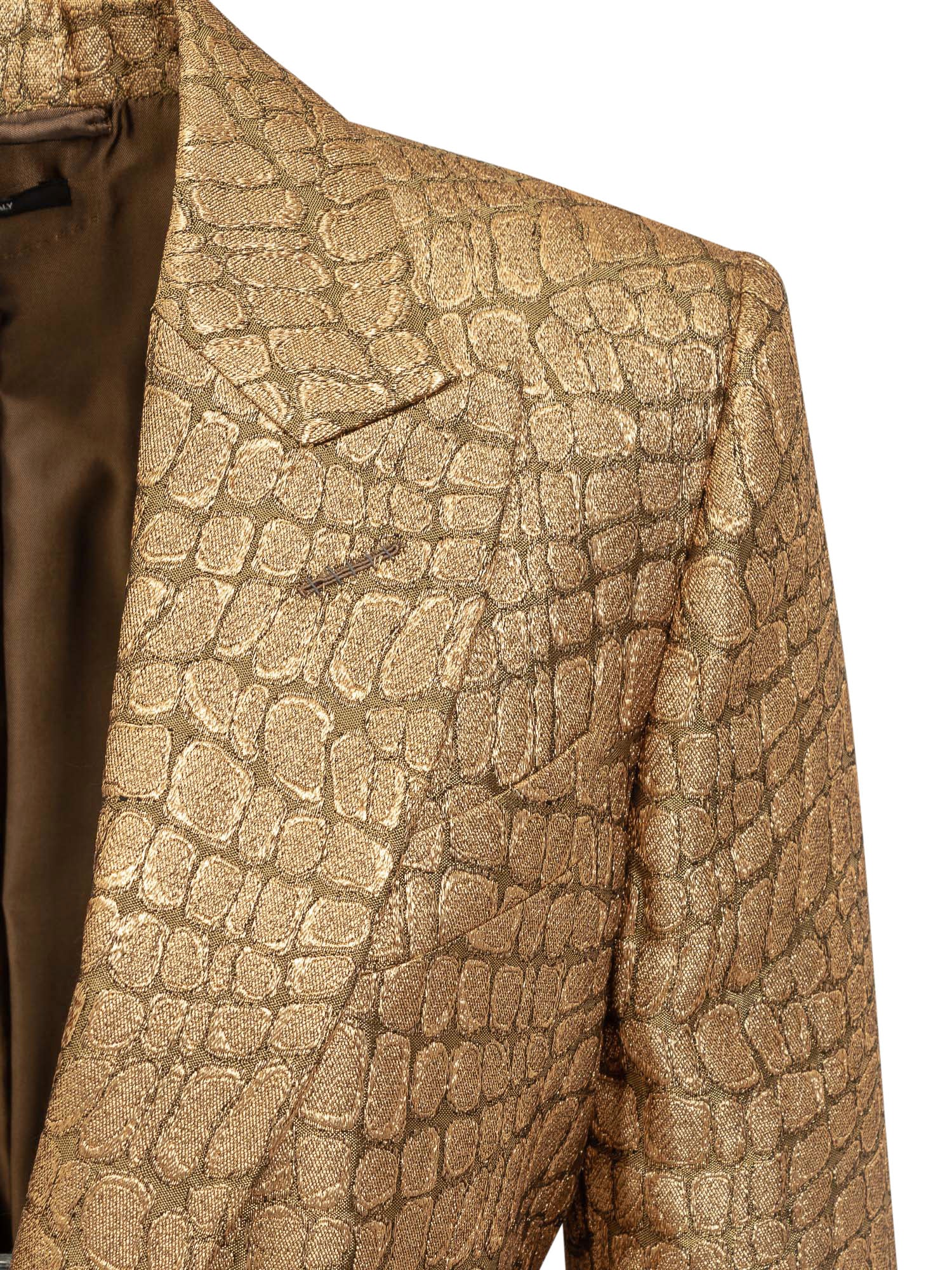 Single-breasted blazer with long sleeves. V-neck with classic collar and peaked lapels. Button closure. Button cuffs. Vintage gold metal buttons. Two flap pockets on front. Boat-shaped chest pocket. Inside pockets. Lined interior. Croco Jacquard pattern with all-over gold effect.