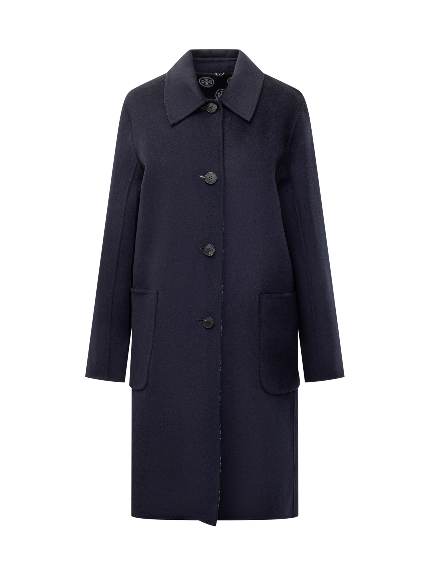 Tory Burch navy blue wool coat with button closure and patch pockets.