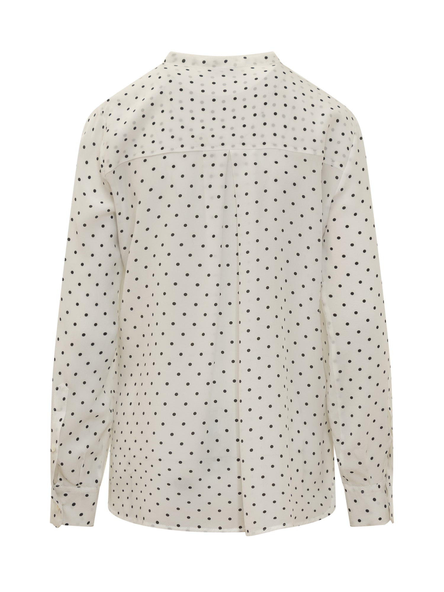 Long sleeved silk shirt. Korean collar. Concealed button closure. Button cuffs. Polka dot pattern all over. Semi-transparent. Asymmetric hem.