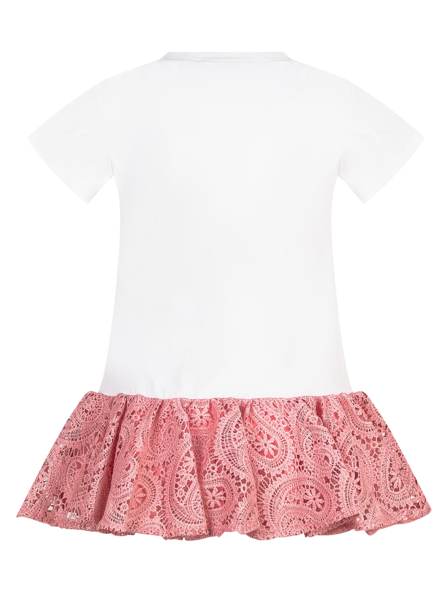 Twinset girls dress in white jersey with printed hearts, 3D bows, and pink lace flounce.