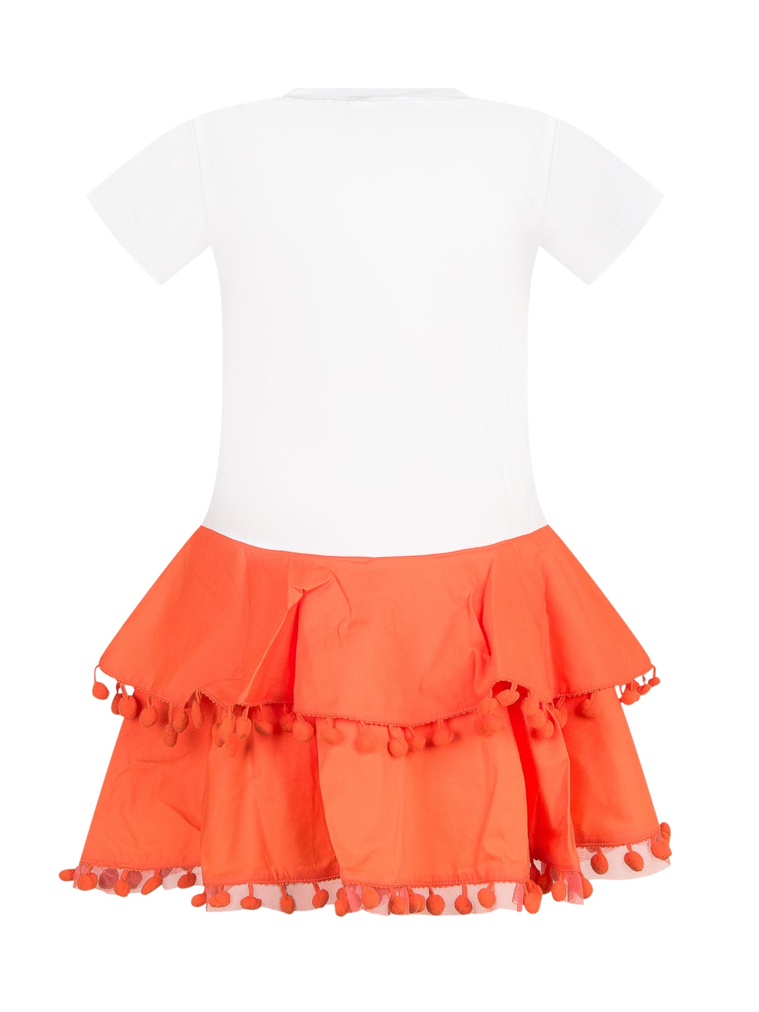 Twinset girls dress with white jersey top featuring bow prints and tiered orange skirt with pom-poms.