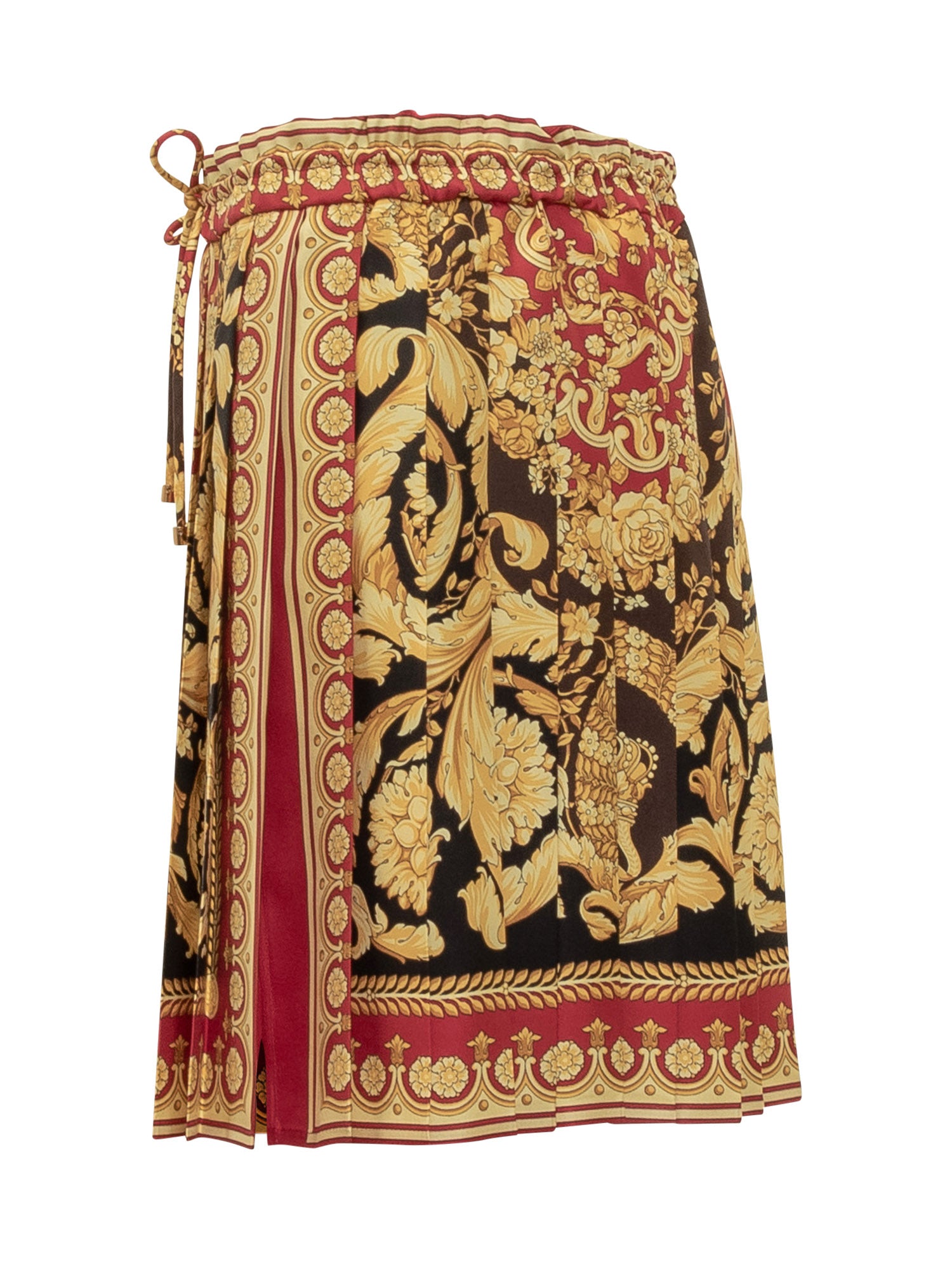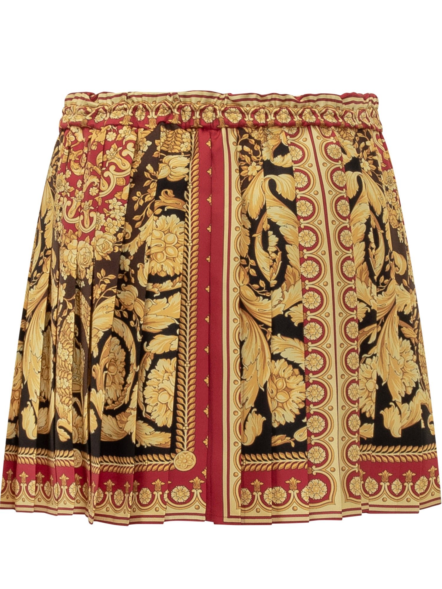 Short pleated Versace skirt with elastic waistband and baroque print in gold, red, and black tones.