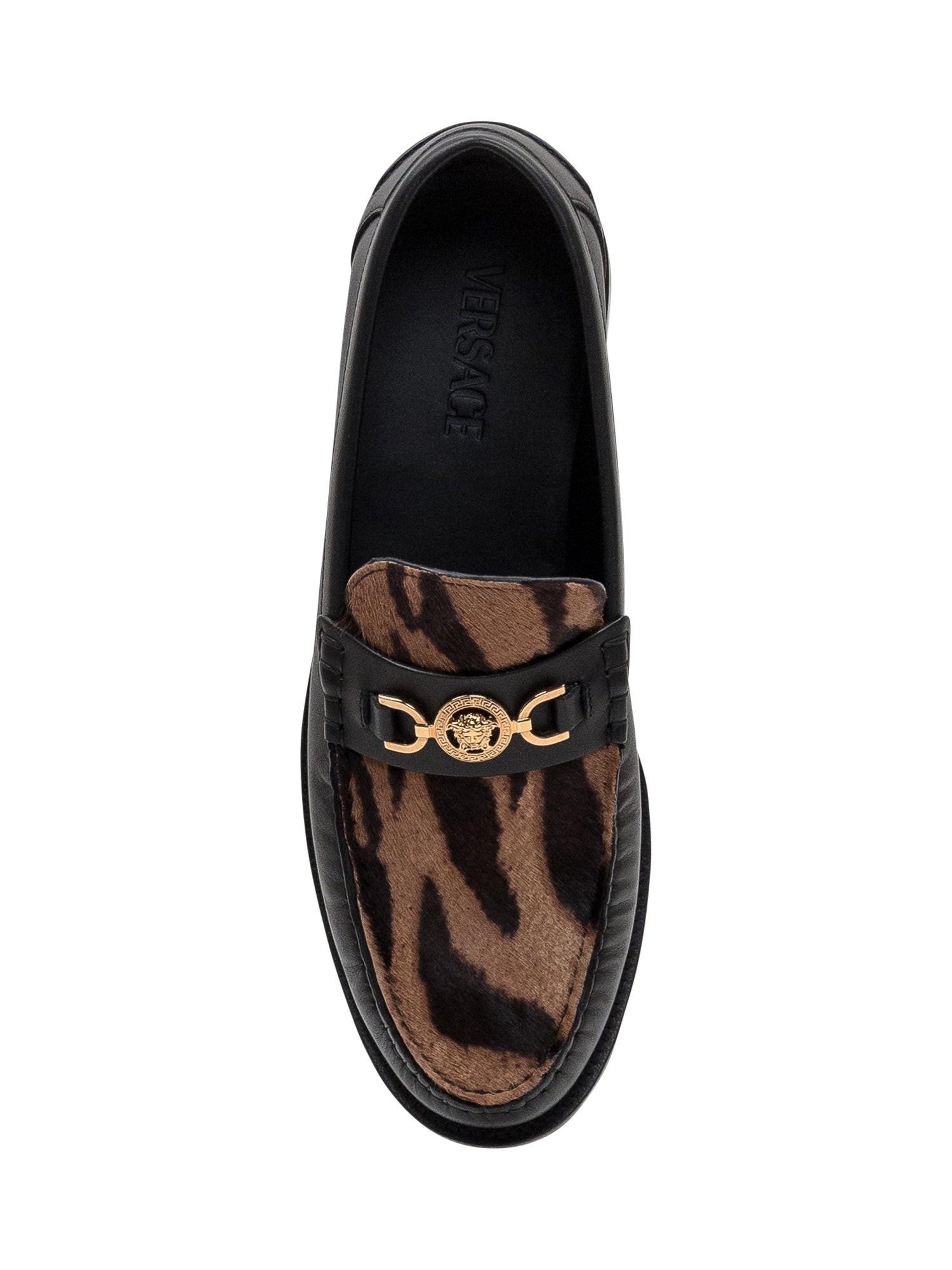 Men s Versace loafers in black leather with animalier insert and iconic gold Medusa detail.
