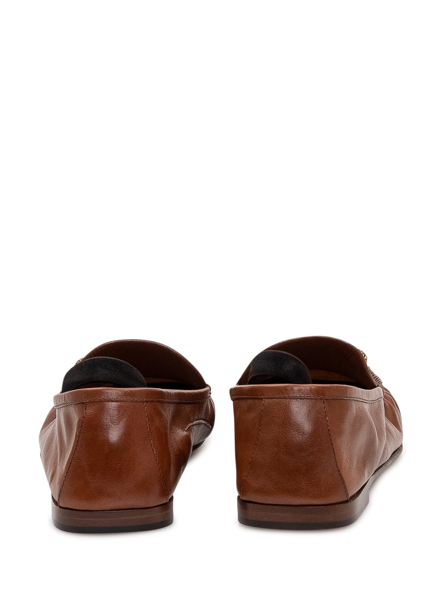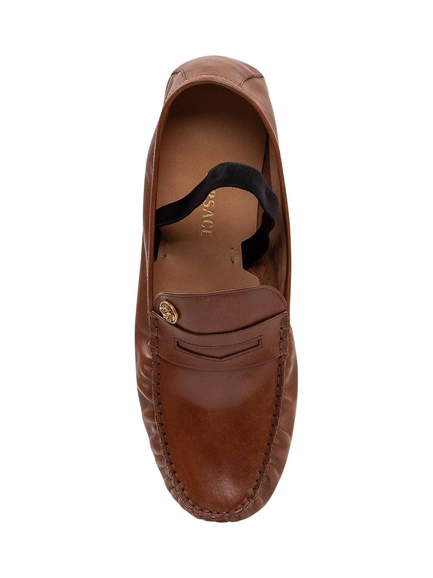 Slip on loafers with rounded toe, featuring front strap with metal logo detail. Visible stitching along the upper and low sole. Classic design with clean cut silhouette.