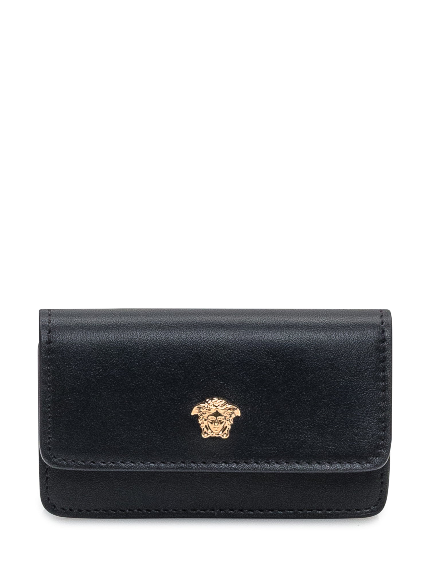 Black leather key holder with iconic gold Medusa logo. Compact and refined design, ideal for keeping keys with elegance and the signature Versace luxury touch.