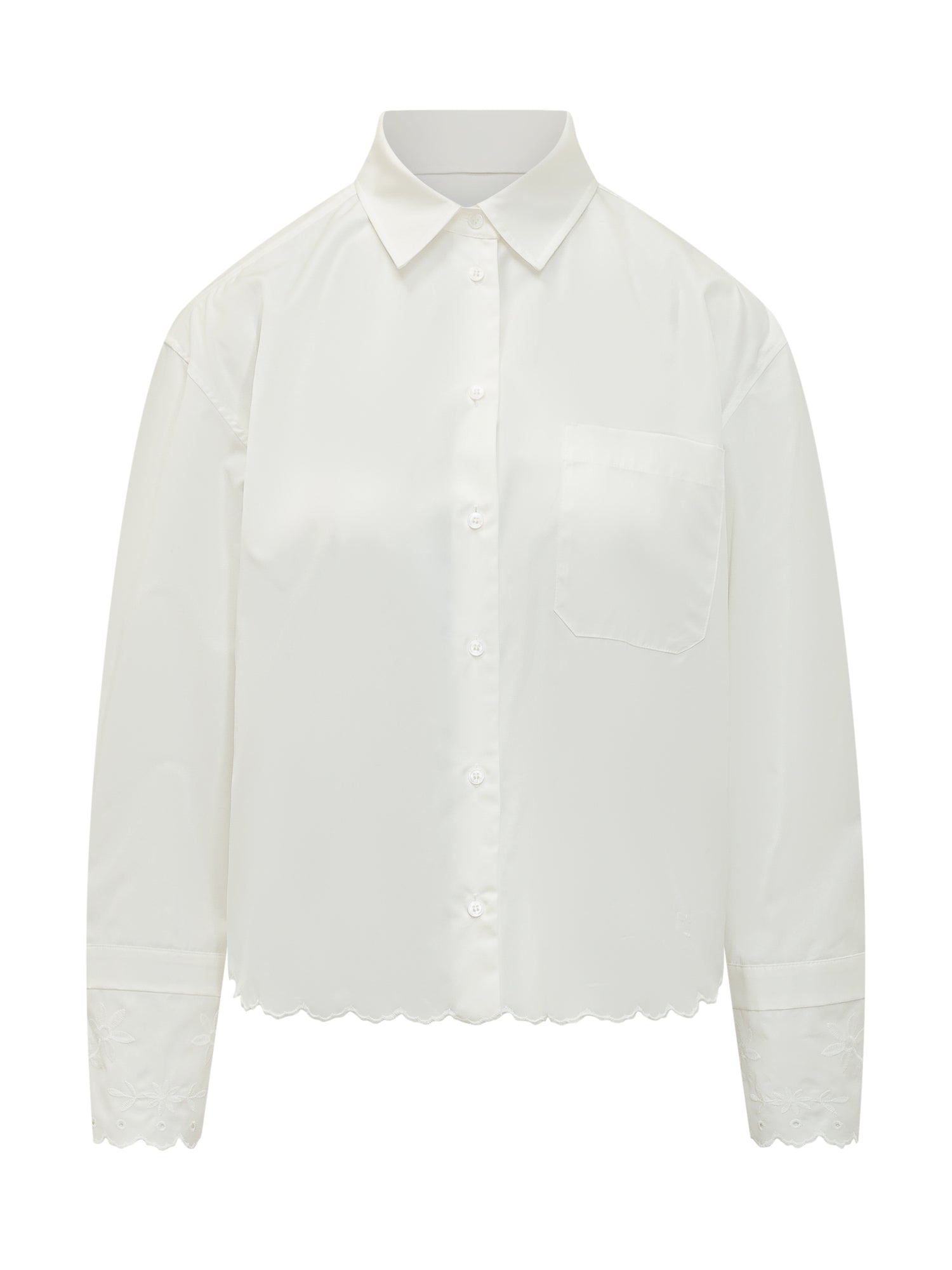 Shirt with classic collar, button closure, long sleeves with embroidered cuffs, patch chest pocket, scalloped hem.