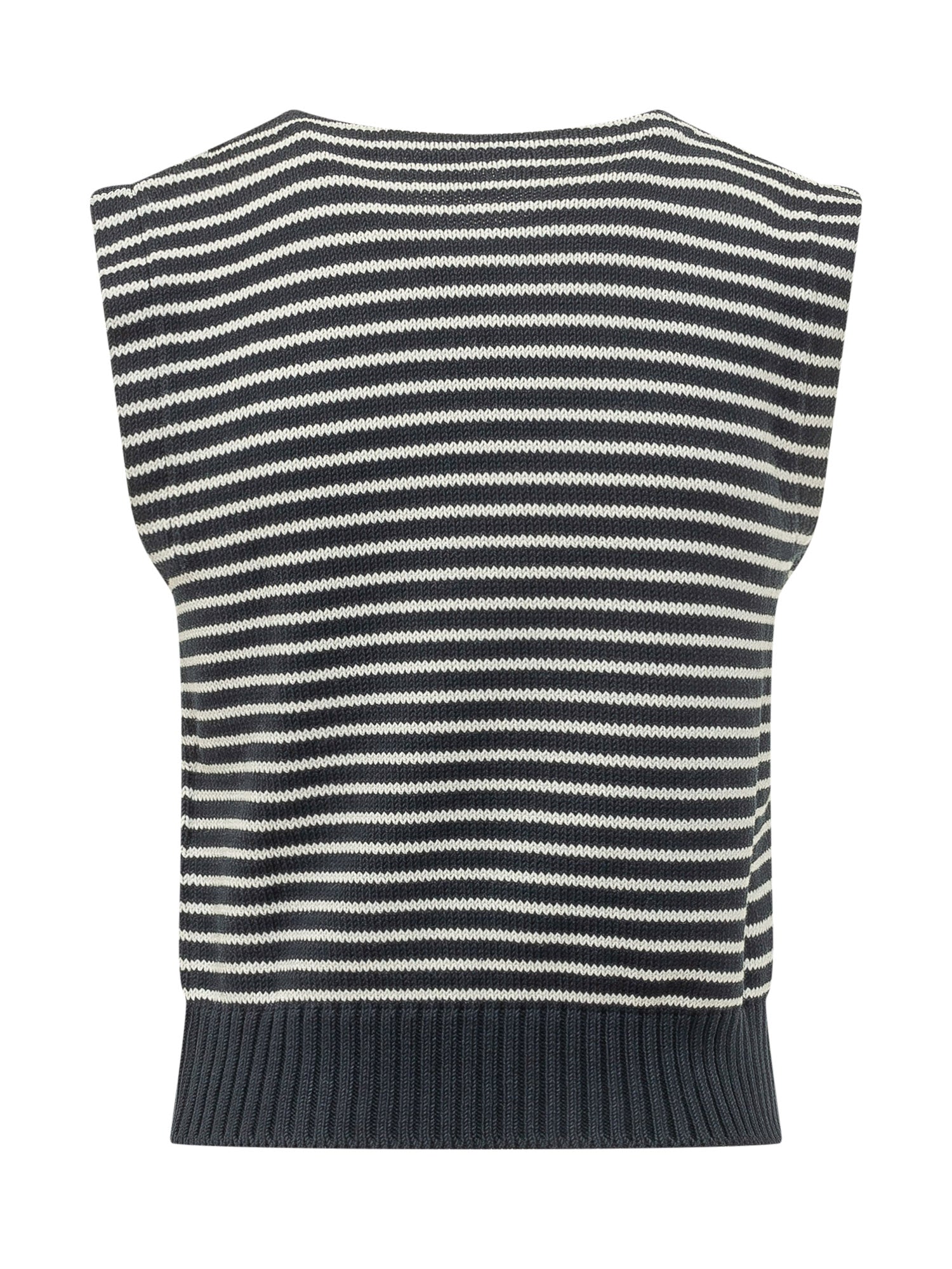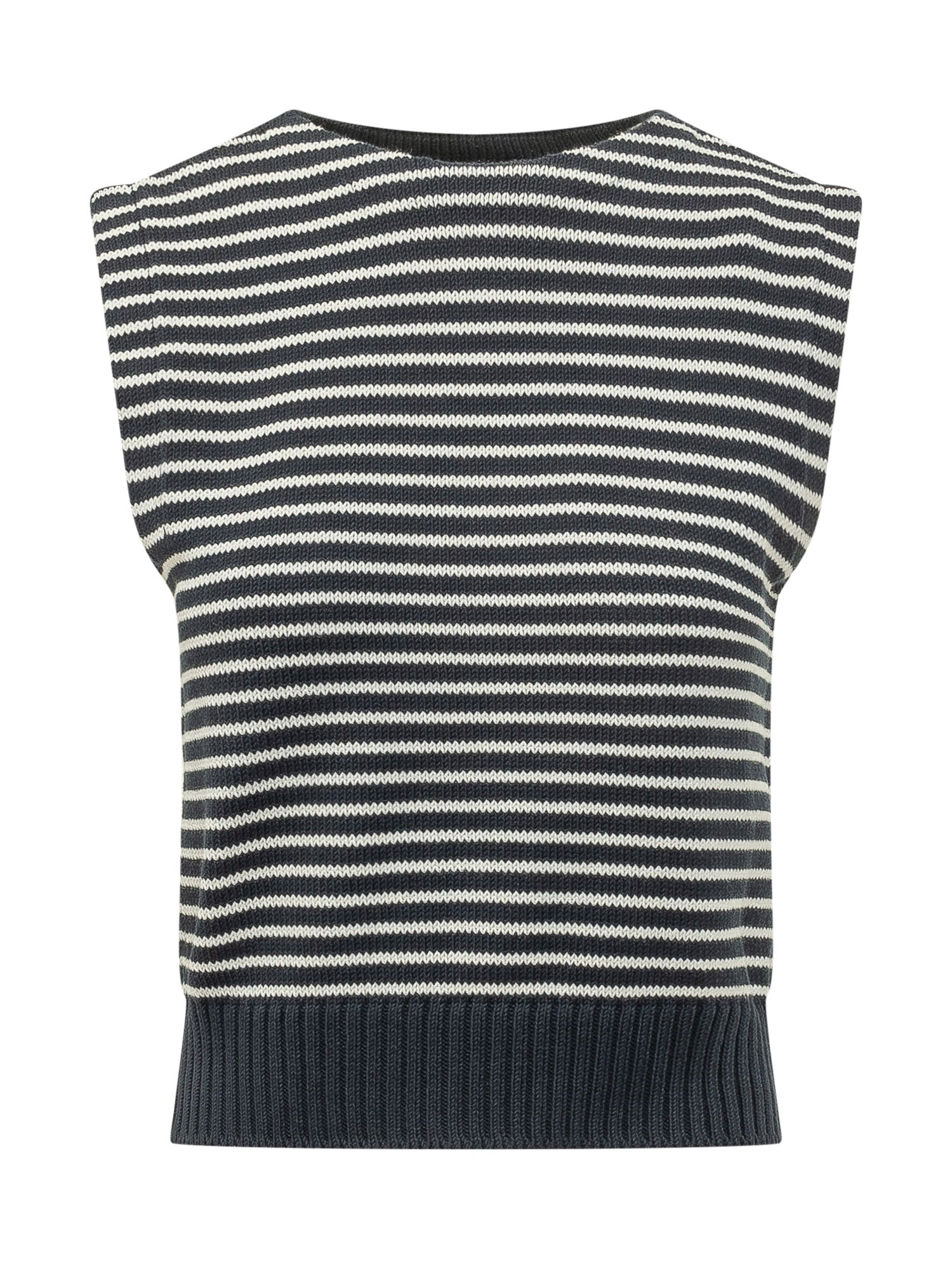 Knitted vest with horizontal stripe pattern and crewneck. Sleeveless design with ribbed hem, regular fit ideal for layering and creating contemporary everyday looks.