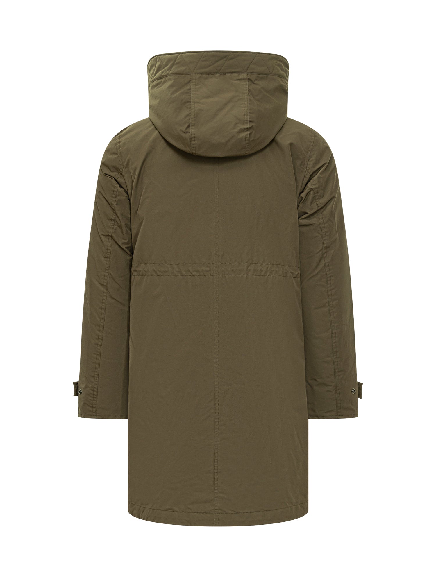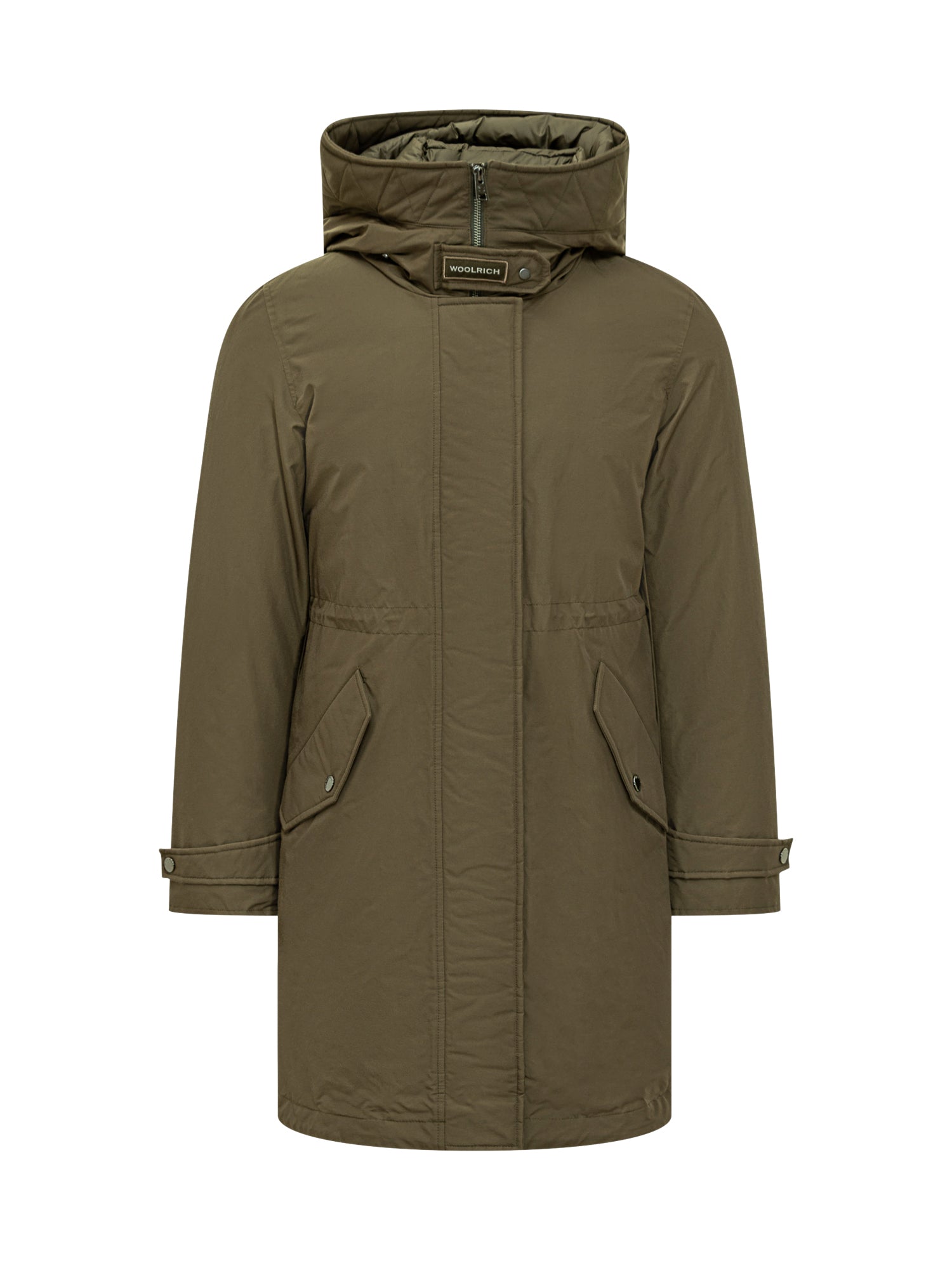 Woolrich long parka with padded hood, concealed closure, and flap pockets.