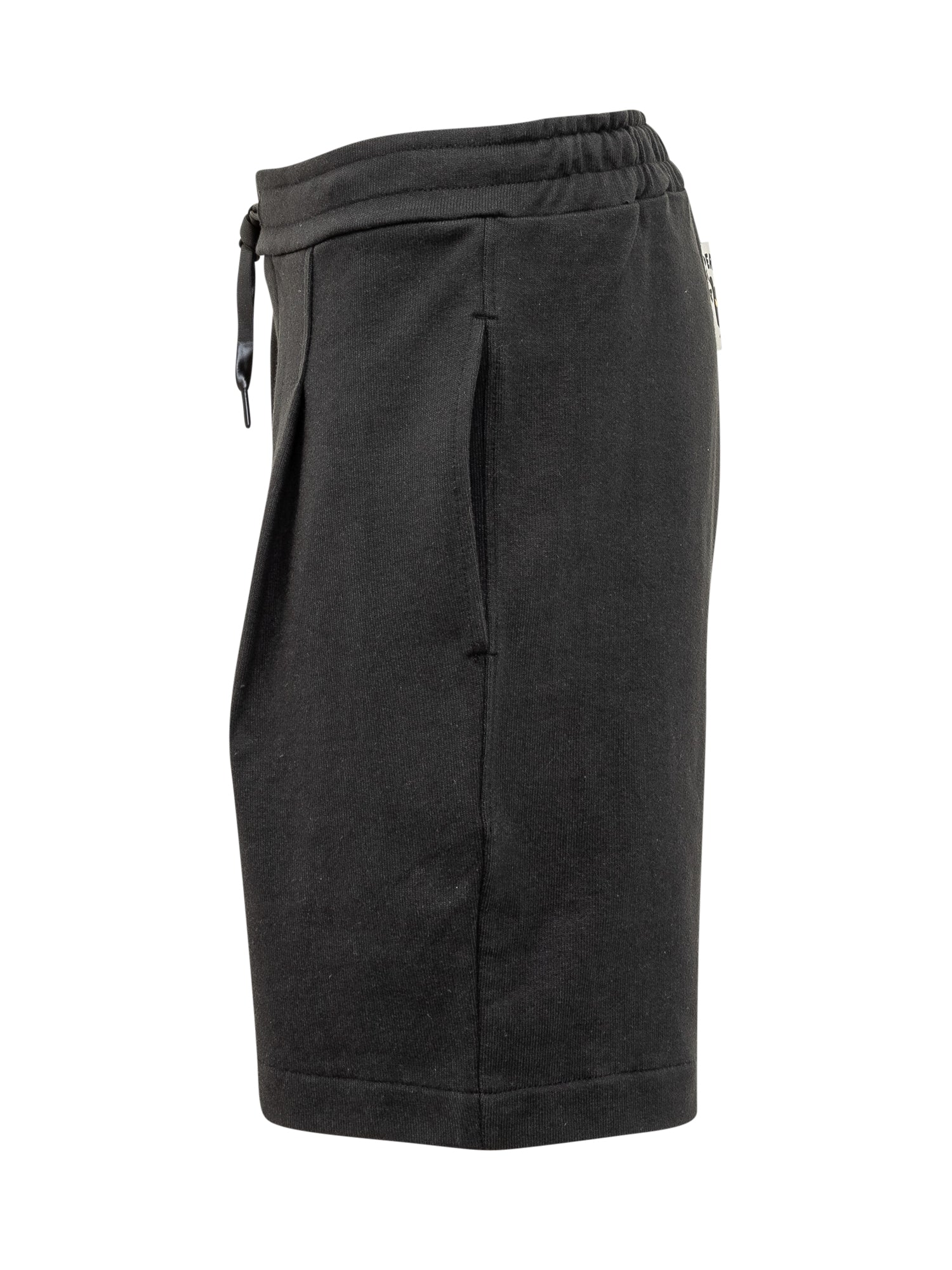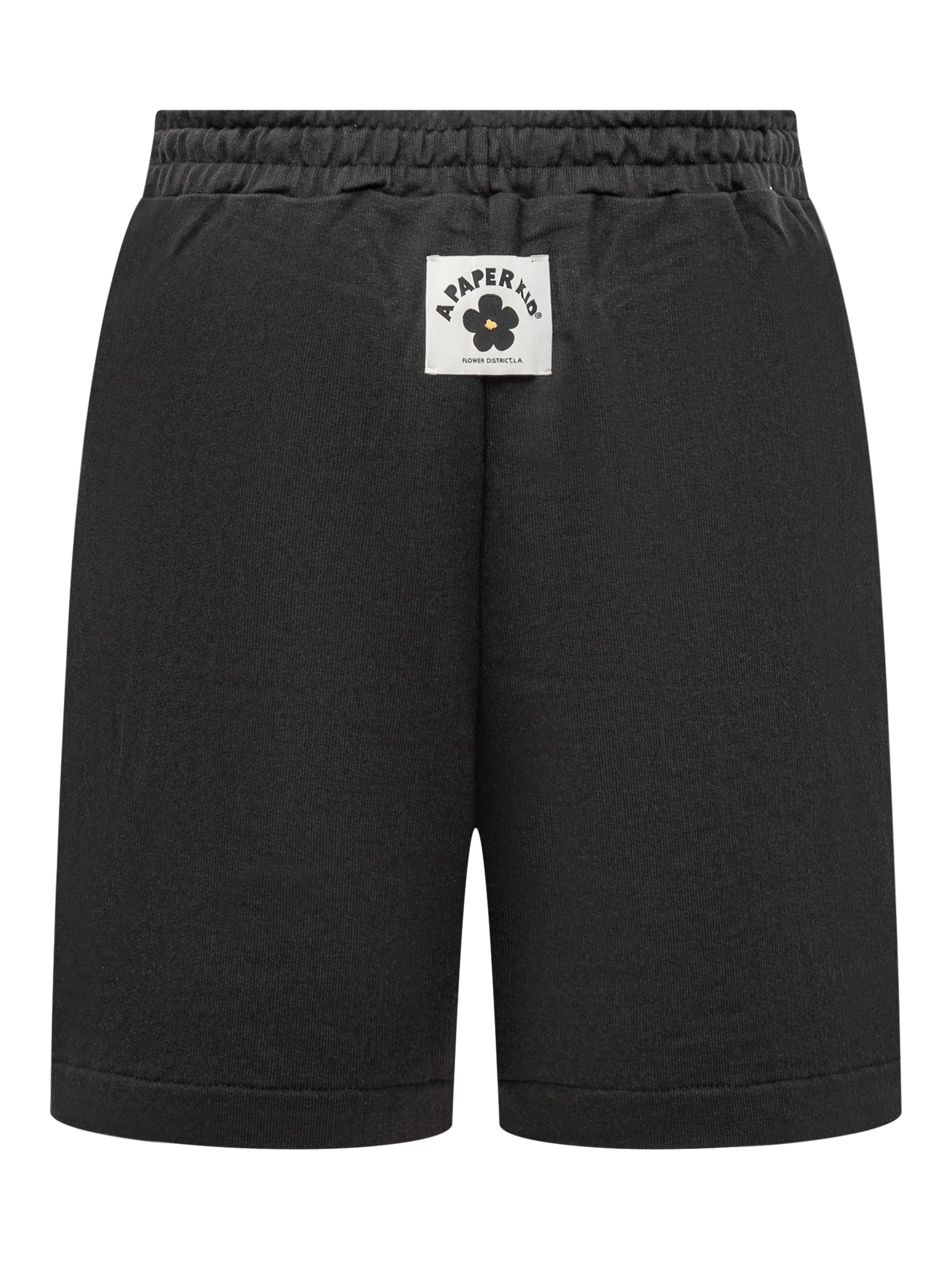 Pantaloni corti neri. Elastico nel punto vita con coulisse. Tasche a filo ai lati. Etichetta con logo A PAPER KID cucita sul retro.