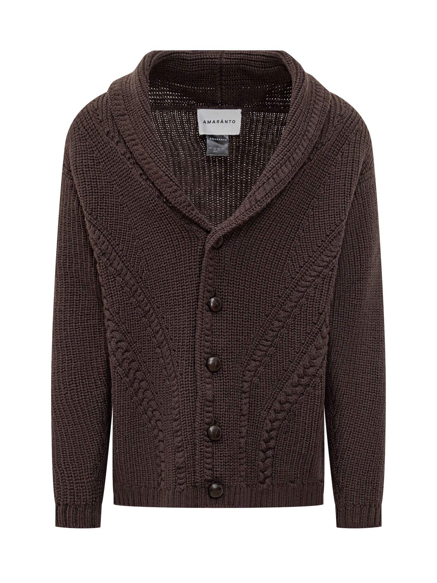 Cardigan Amaranto in maglia marrone con lavorazione a treccia e collo sciallato. Chiusura frontale con bottoni.